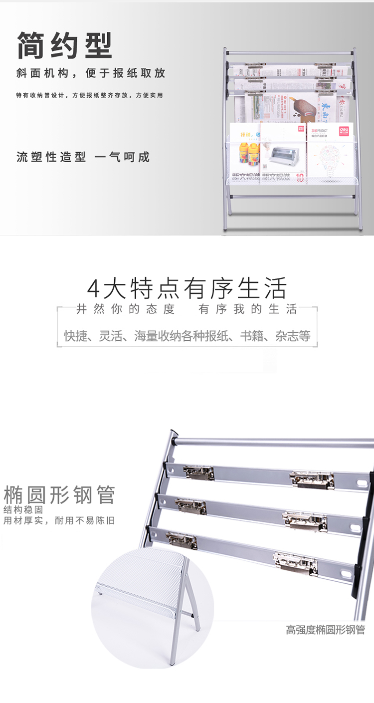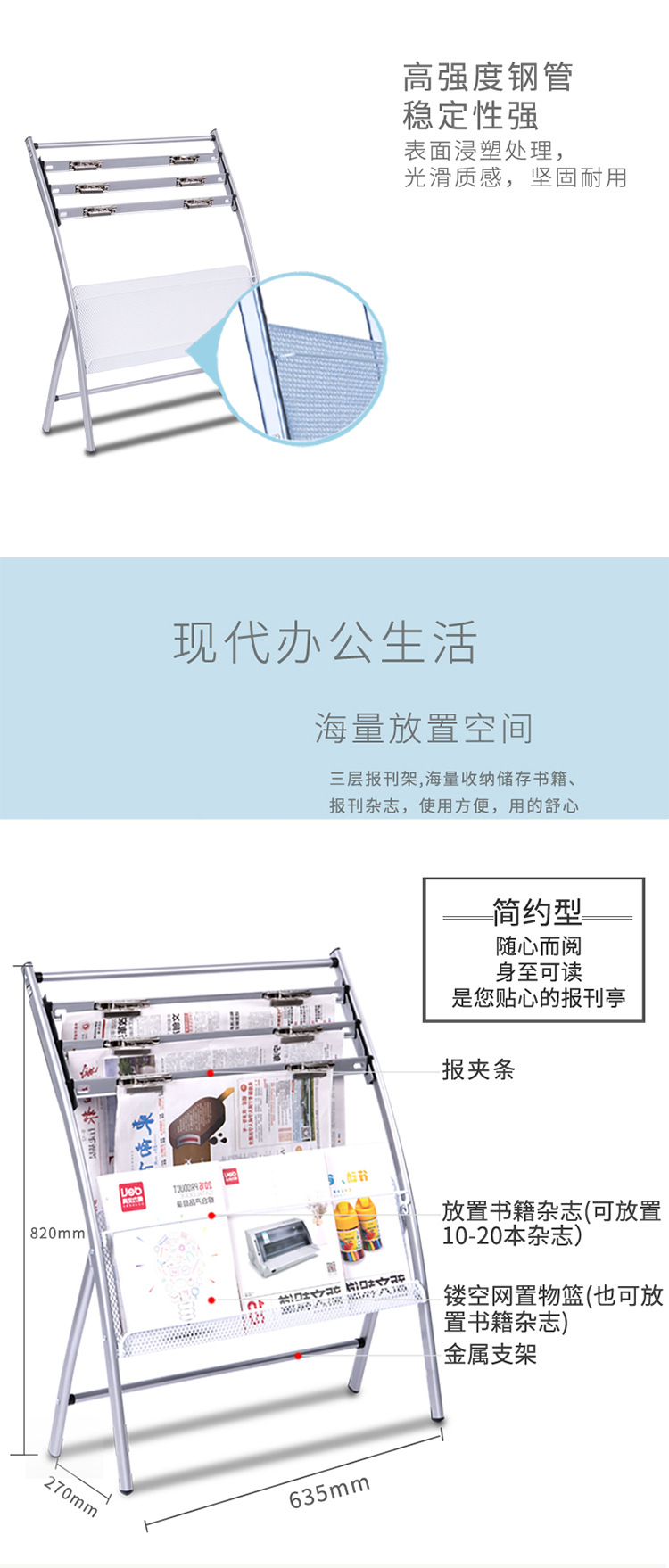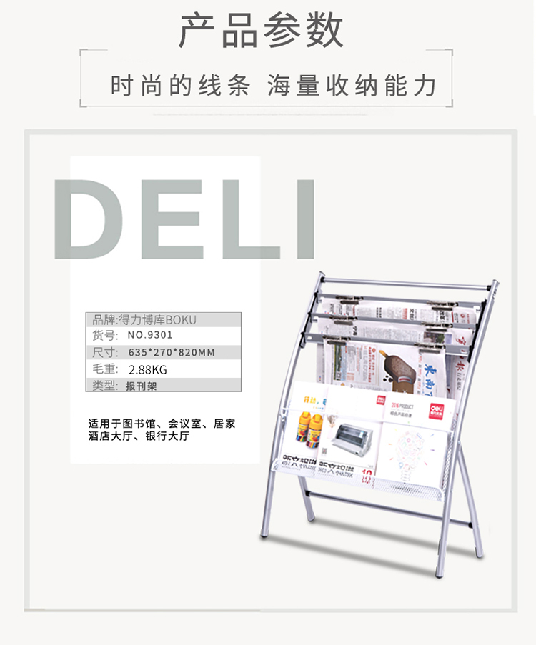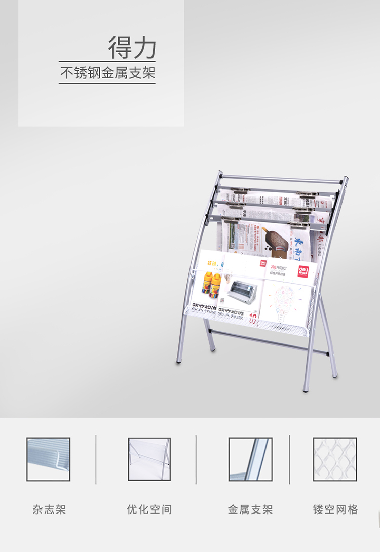 • 商品名称:得力(deli) 9301 四层铝合金夹条报纸架报刊架 图书馆报夹条 宣传杂志展示架 高0.8米