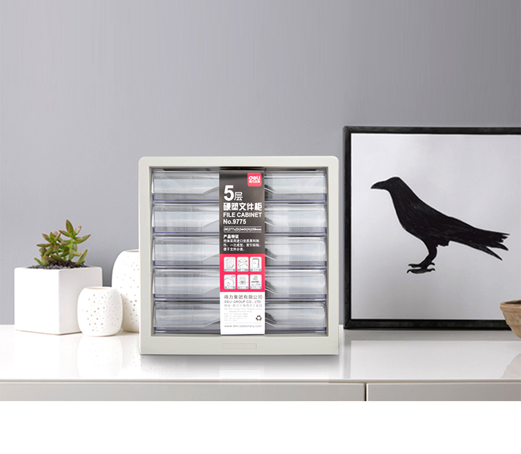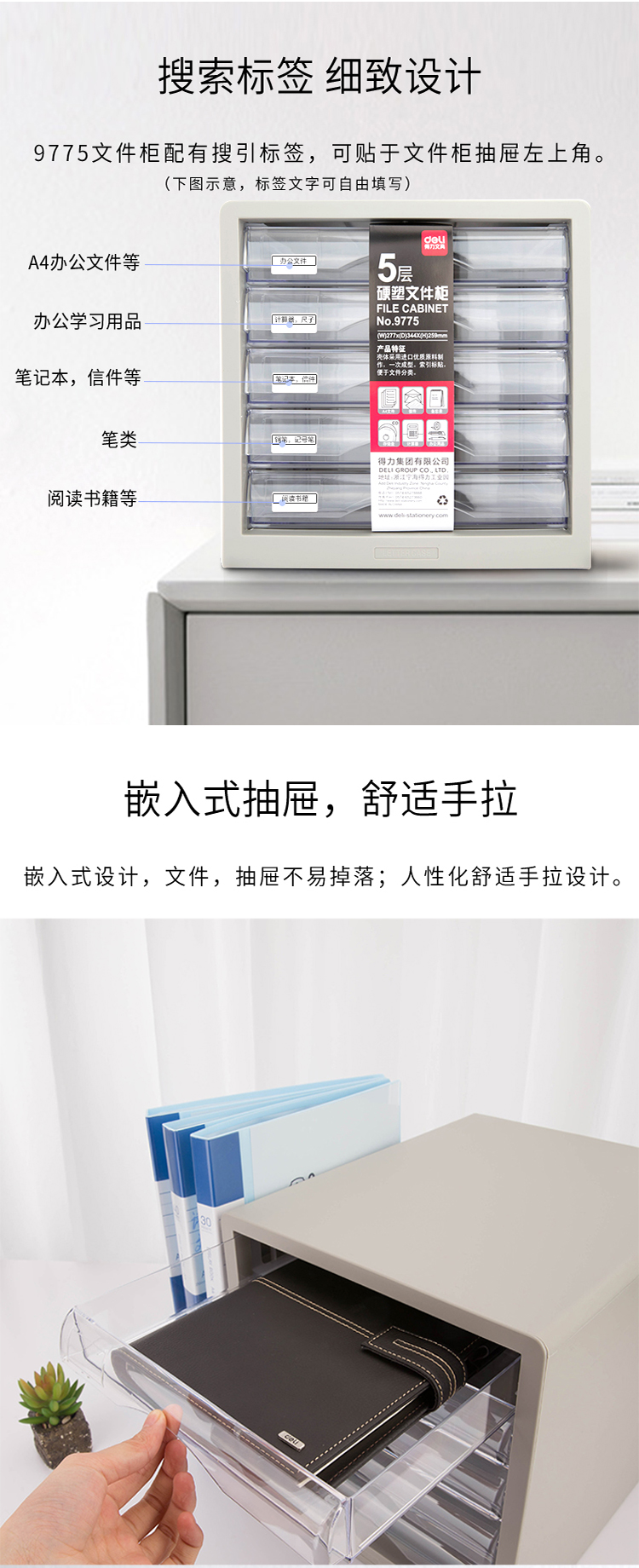 • 商品名称:得力(deli) 9775 5层手拉桌面文件柜 带索引标签抽屉资料收纳柜 灰色