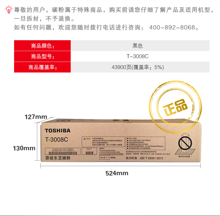 • 商品名称:东芝(TOSHIBA)T-3008C 原装碳粉墨粉(适用于e-STUDIO2508A/3008A/3508A/4508A/5008A)