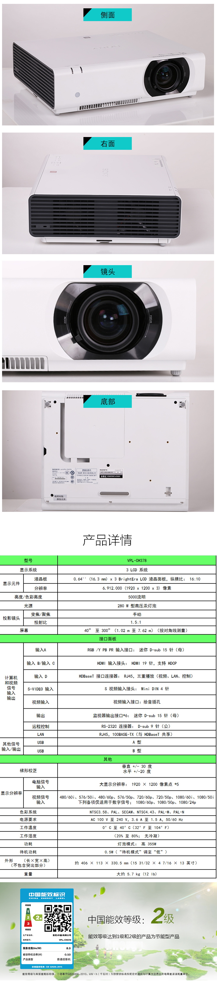 索尼(SONY) VPL-CH378 LCD投影仪 投影机办公 超高清 5000流明 中大型会议