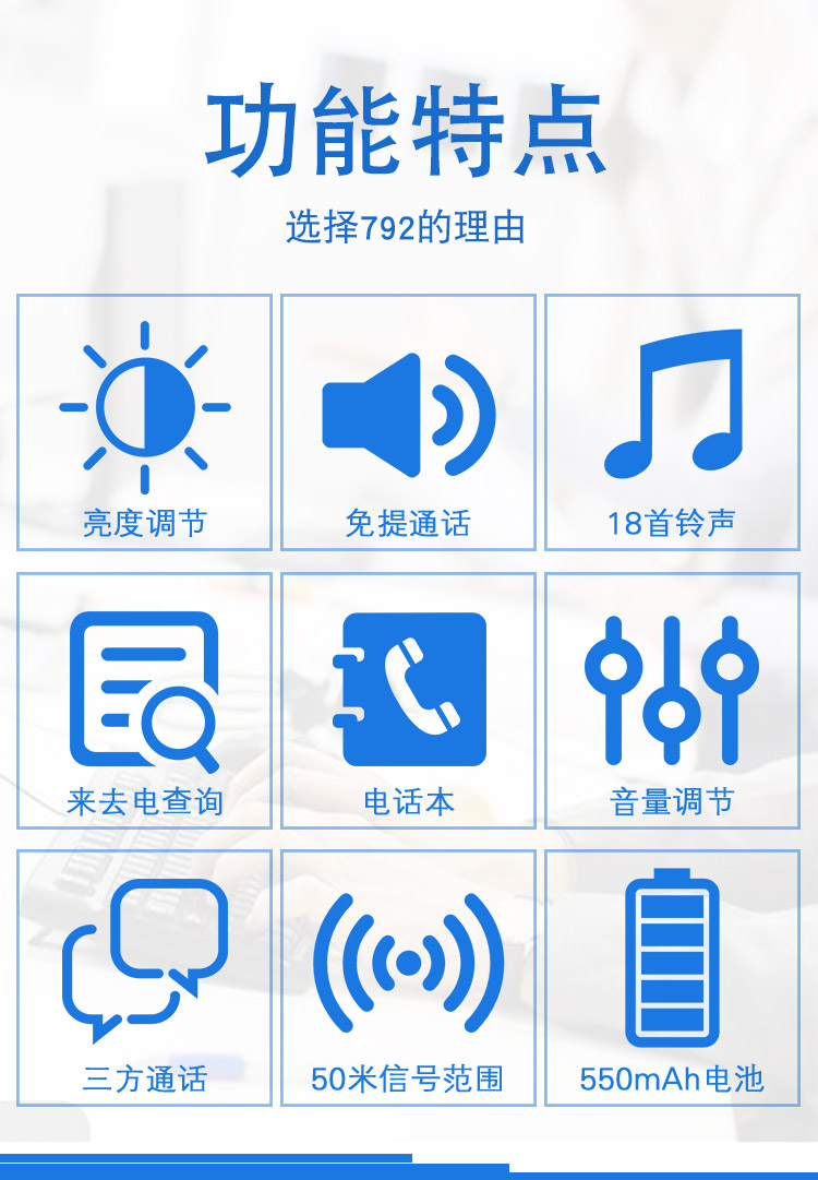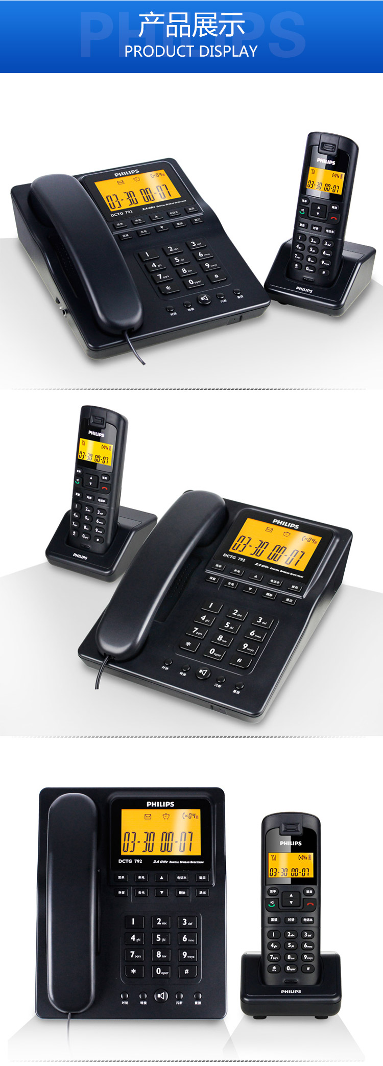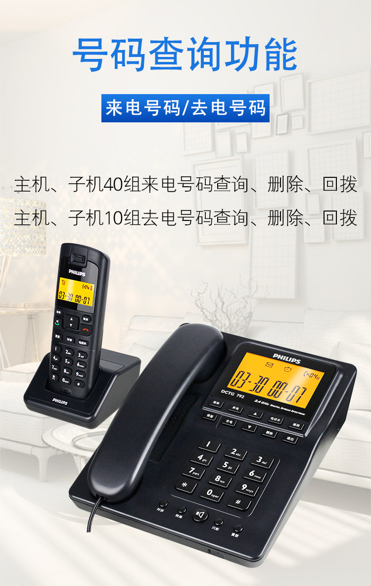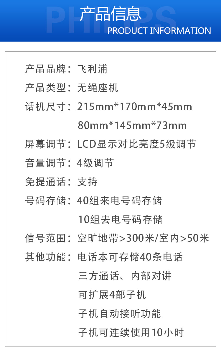 • 商品名称:飞利浦(PHILIPS) DCTG792 无绳电话机 无线座机 子母机 待机持久 (一拖一蓝色)