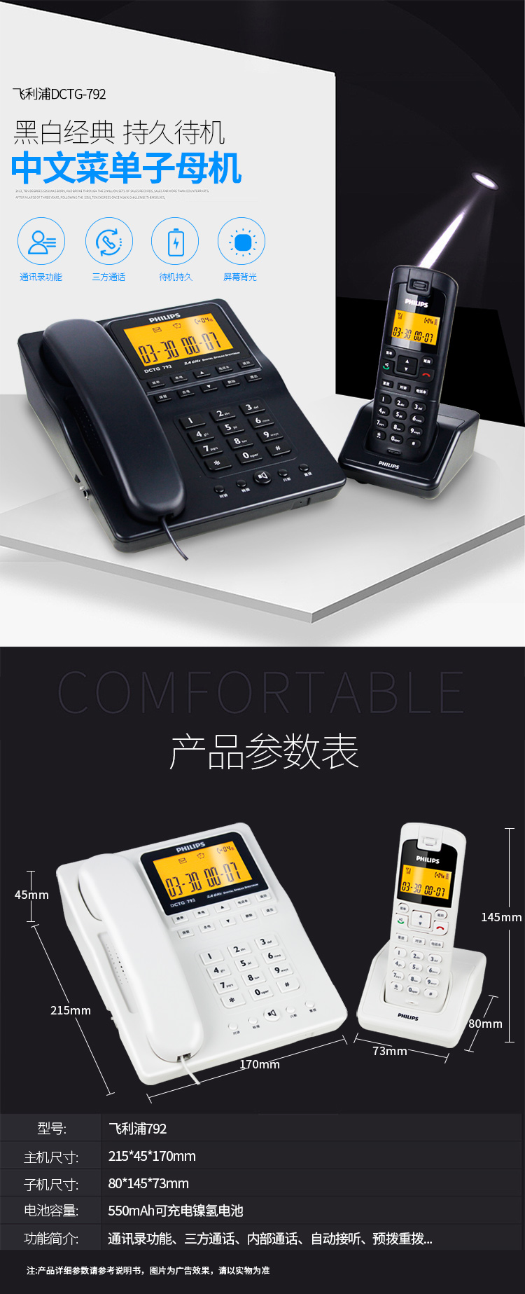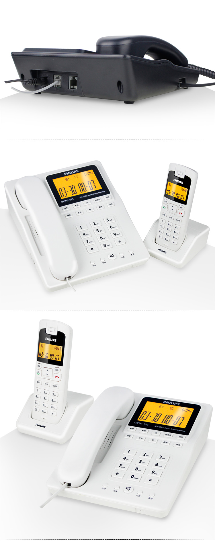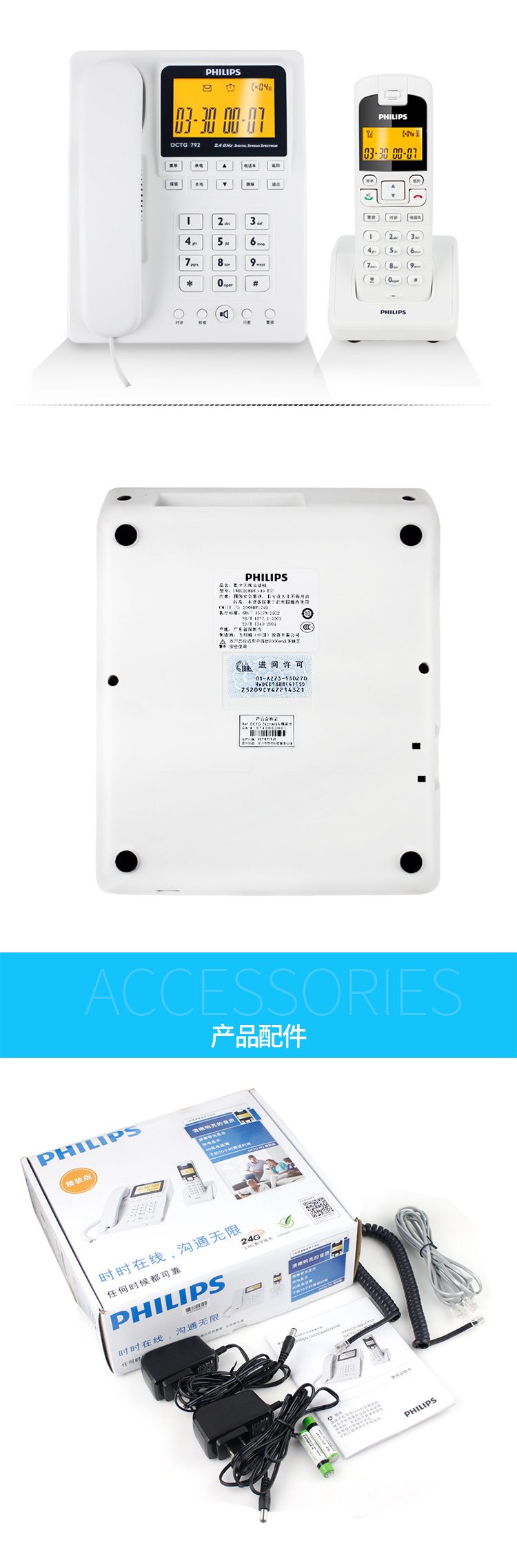 • 商品名称:飞利浦(PHILIPS) DCTG792 无绳电话机 无线座机 子母机 待机持久 (一拖一白色)
