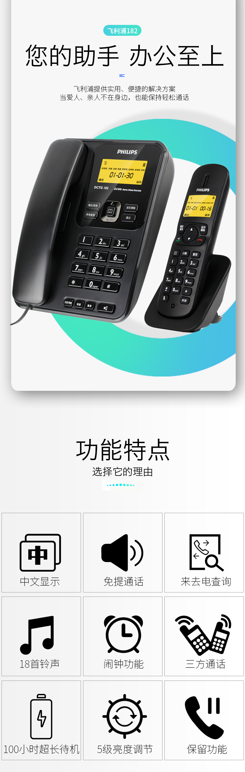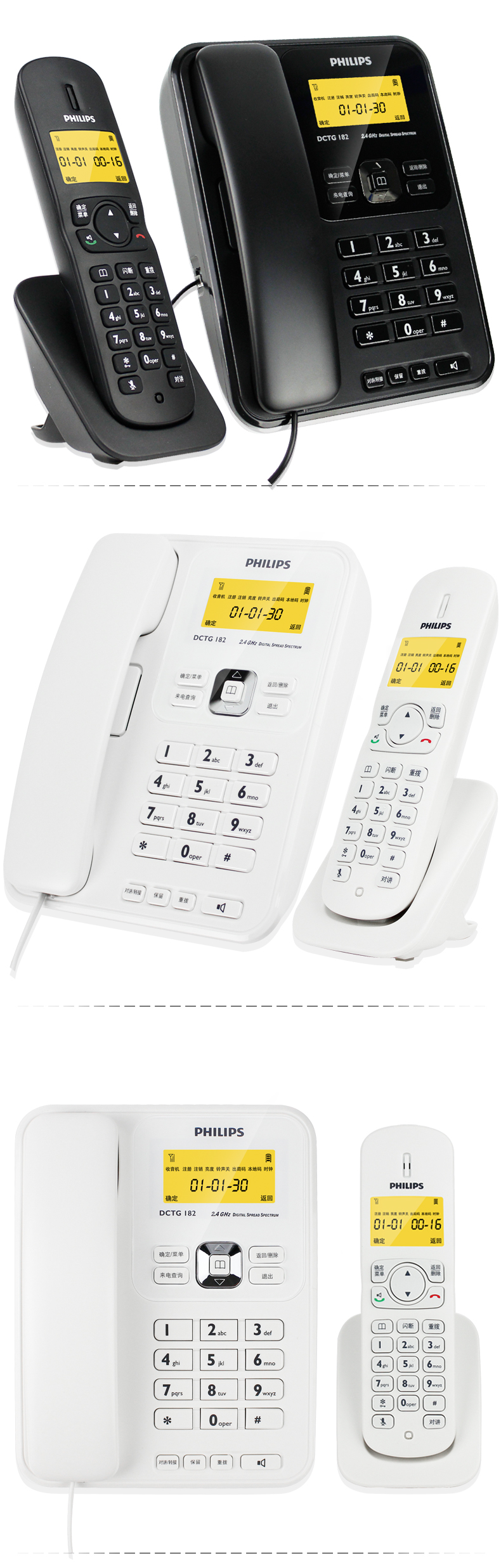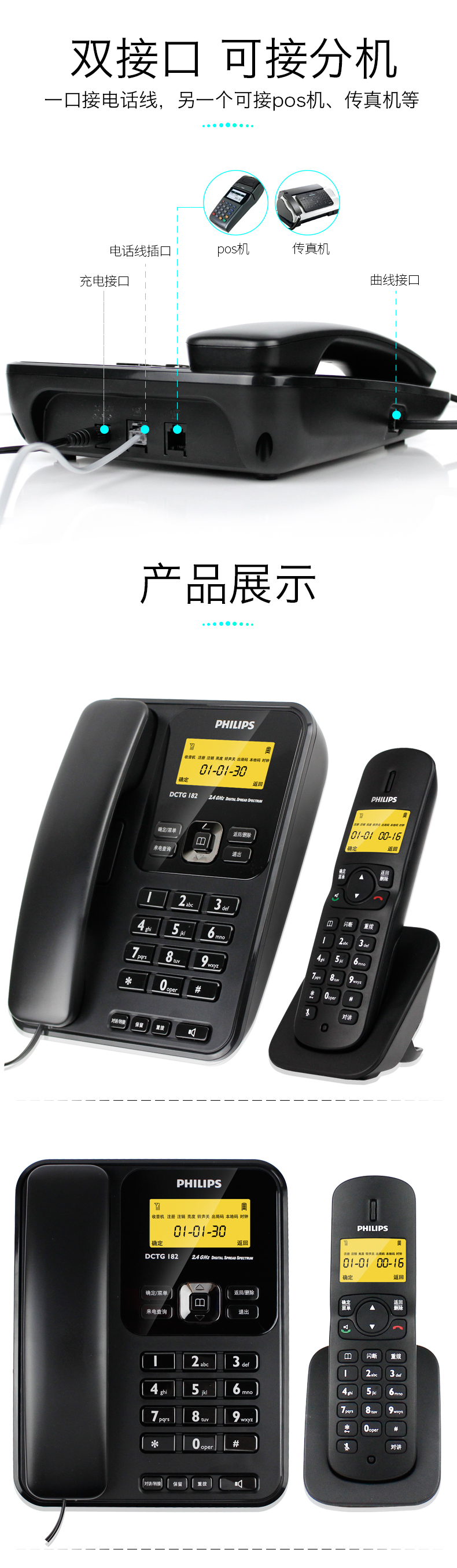 • 商品名称:飞利浦(PHILIPS) DCTG182 无绳电话机 无线座机 子母机 可扩展子机 双免提 一拖一 (白色)