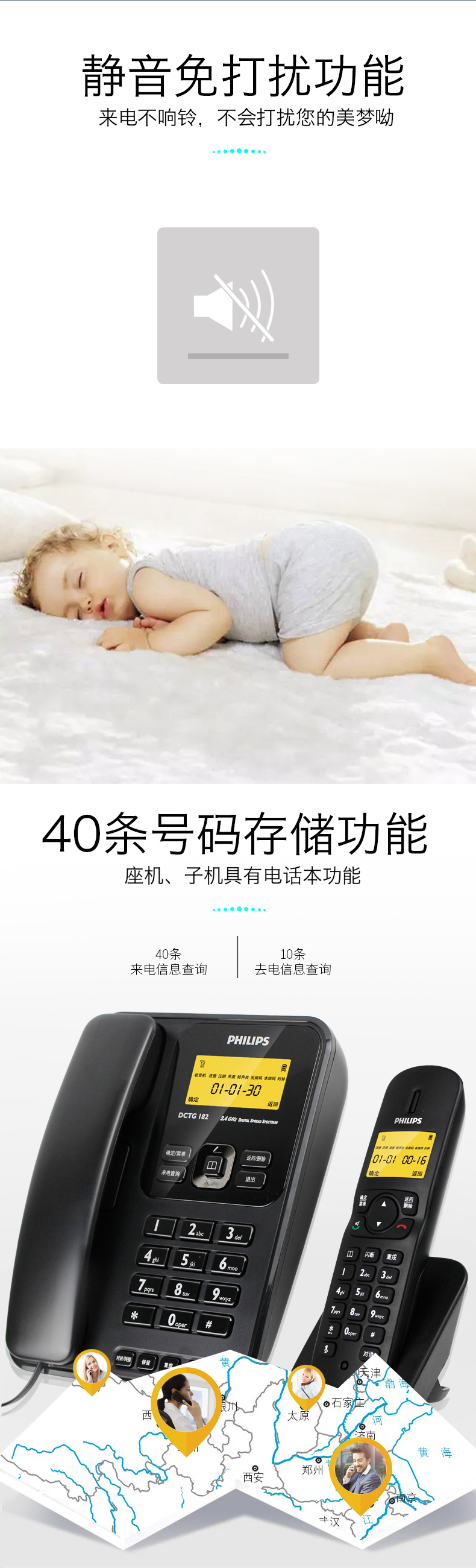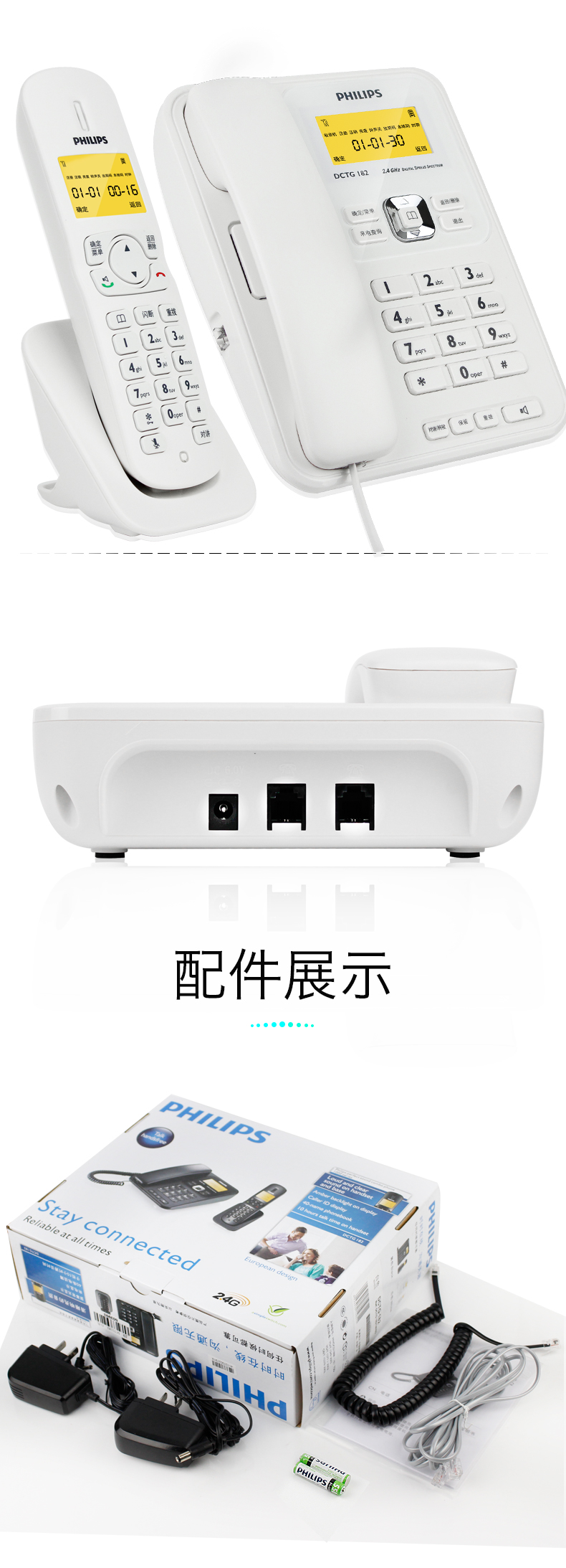 飞利浦(PHILIPS) DCTG182 无绳电话机 无线座机 子母机 可扩展子机 双免提 一拖一 (白色)