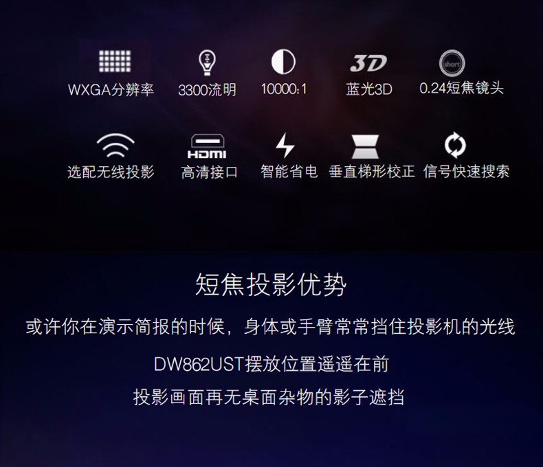 明基(BenQ)DW862UST超短焦投影仪 办公家用教学培训 宽屏高清3D短焦距投影机