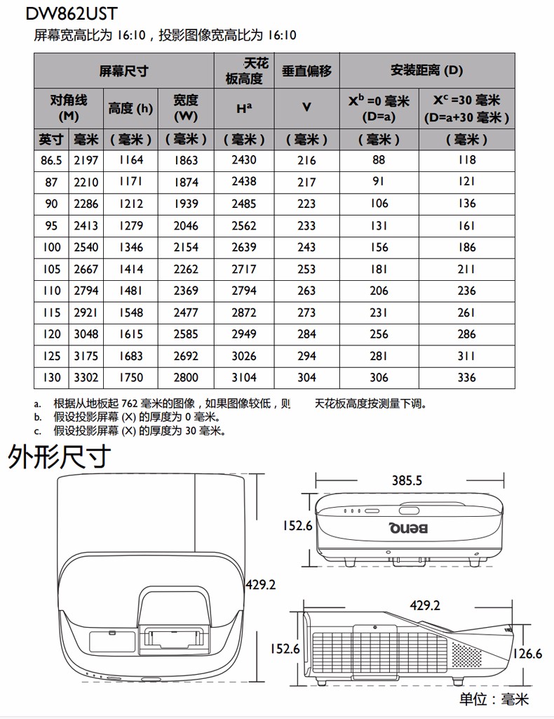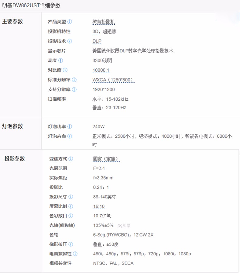 • 商品名称:明基(BenQ)DW862UST超短焦投影仪 办公家用教学培训 宽屏高清3D短焦距投影机