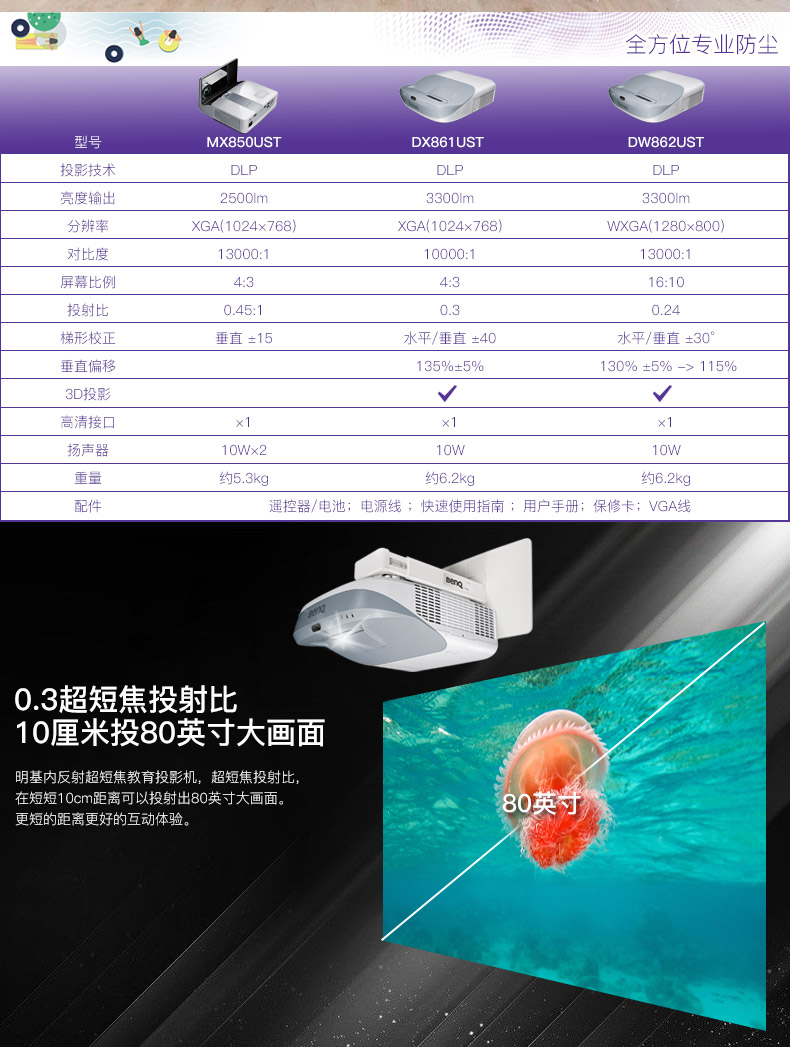 • 商品名称:明基(BenQ)DX861UST 投影仪 办公宽屏 超短焦投影机 (66cm投100英寸) 官方标配