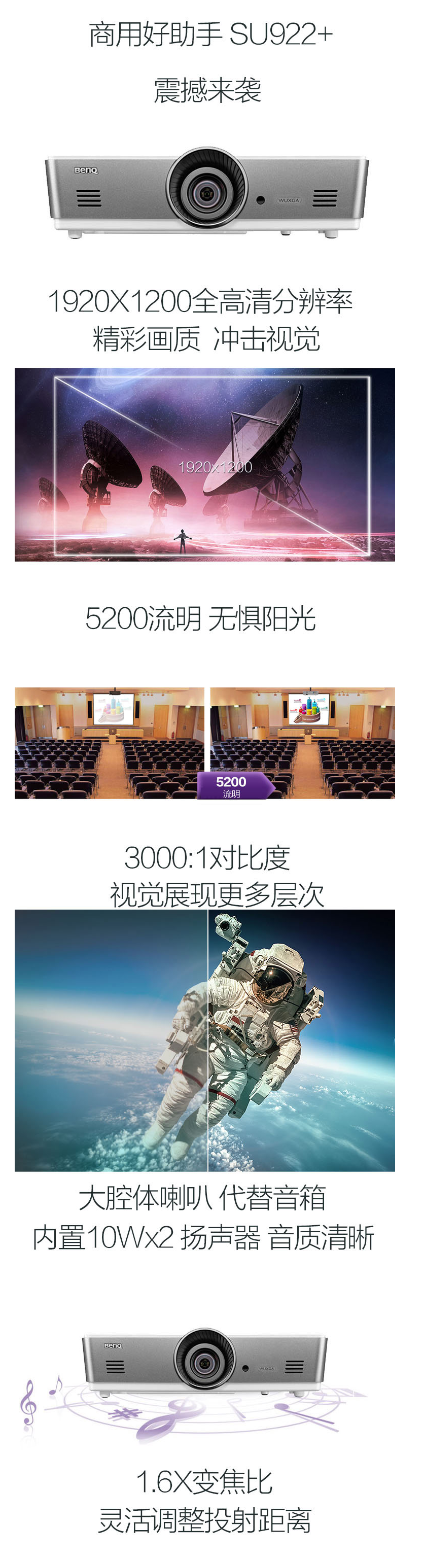 • 商品名称:明基(BenQ)SU922 投影仪 投影机办公(超高清 5200流明 1.6x变焦 左右梯形校正)