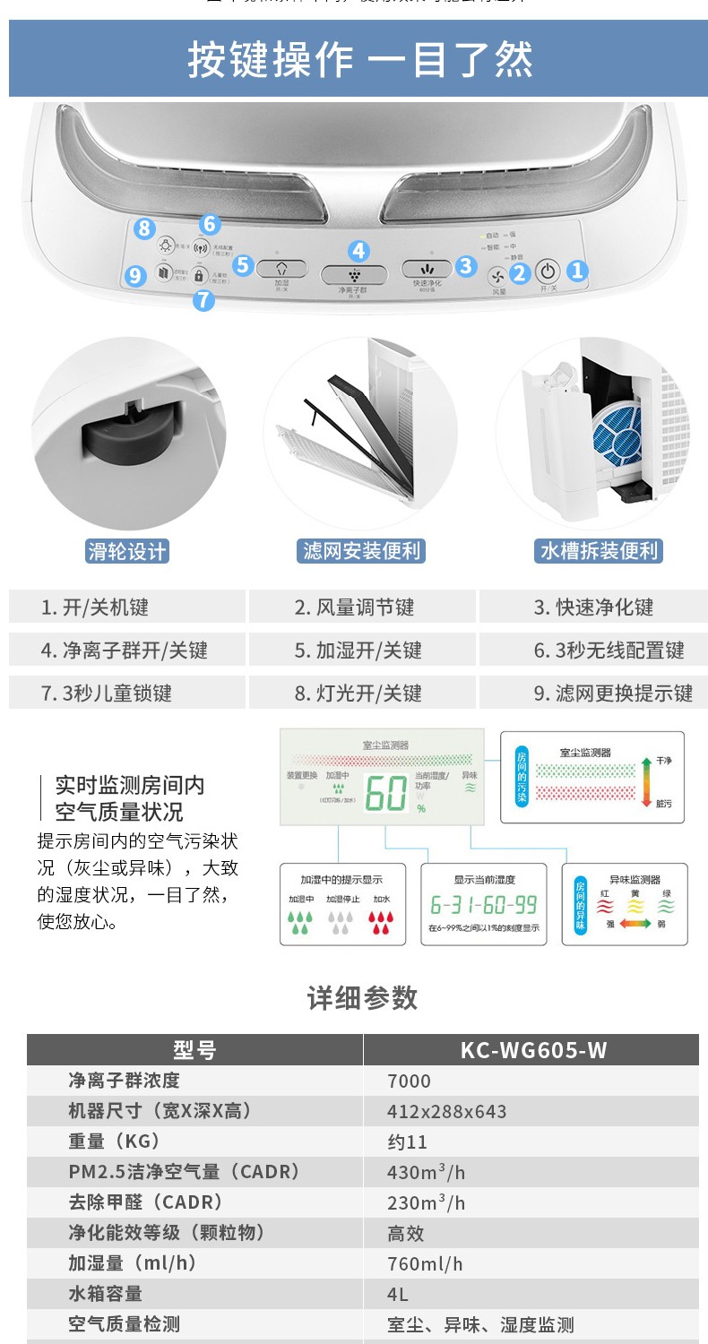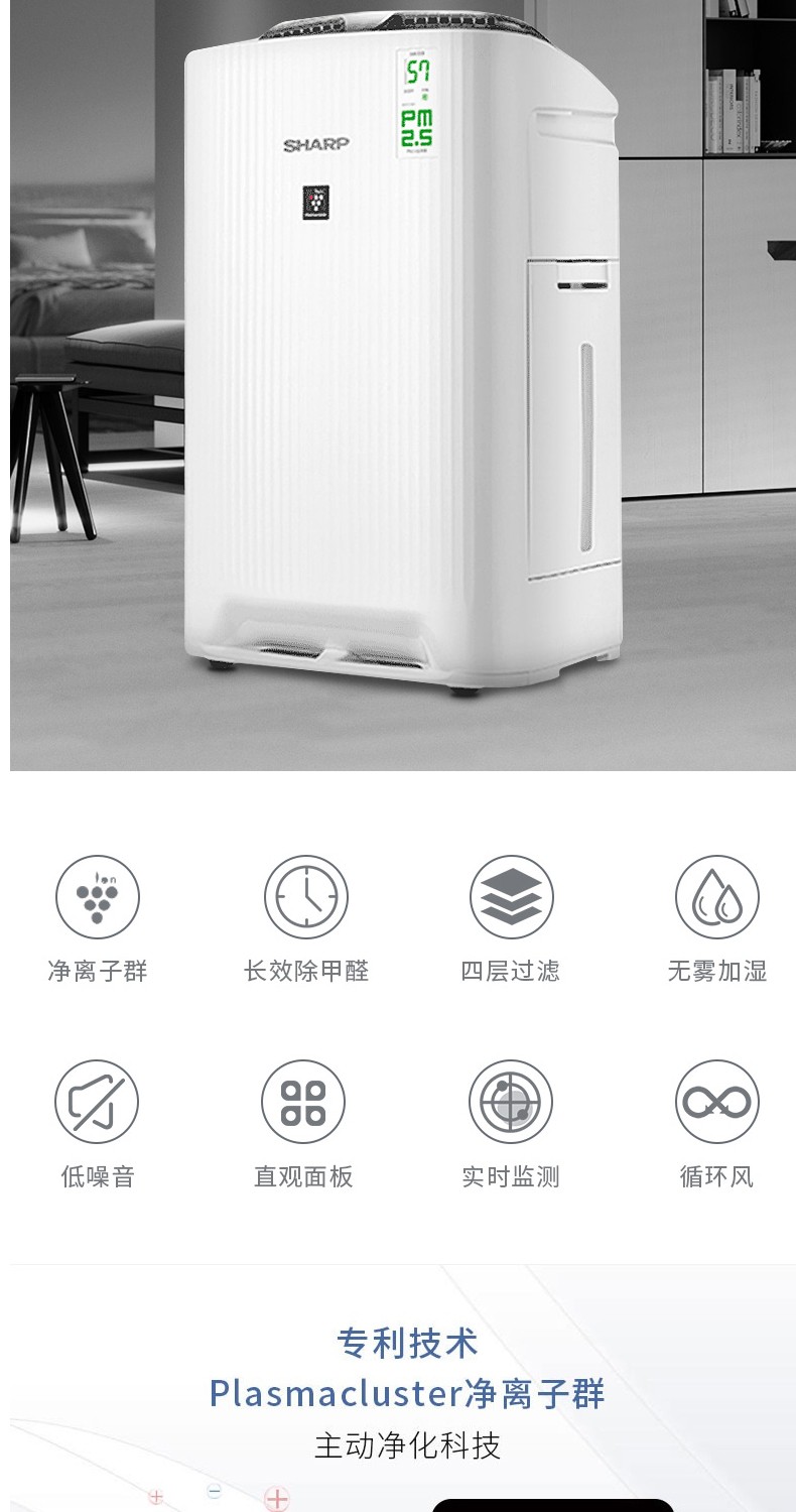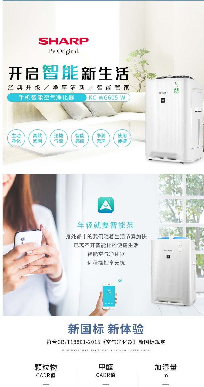 • 商品名称:夏普(SHARP)KC-WG605-W 空气净化器 wifi互联 净化加湿 清除雾霾甲醛 异味 PM2.5