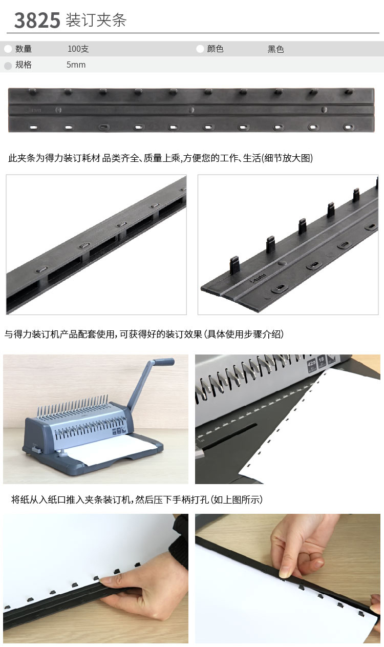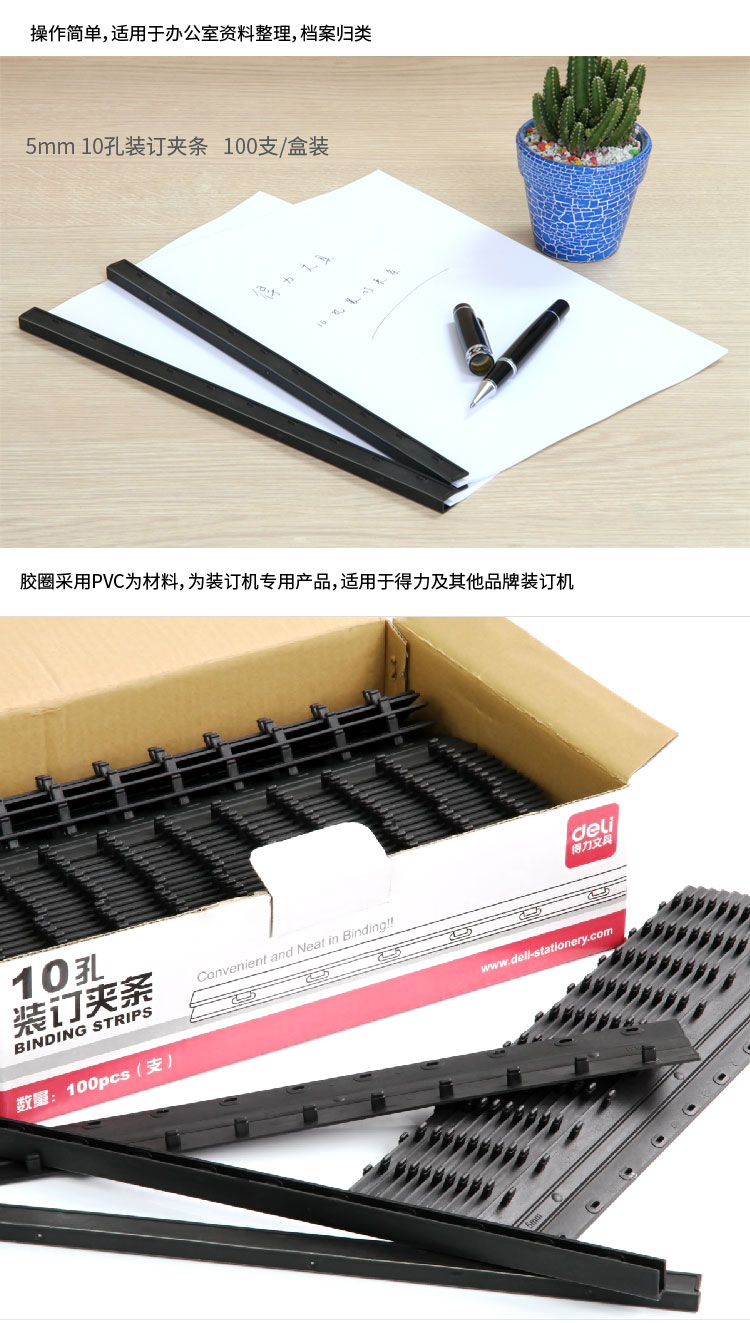 • 商品名称:得力(deli) 3825 10孔装订夹条 5mm 黑色 100支/盒