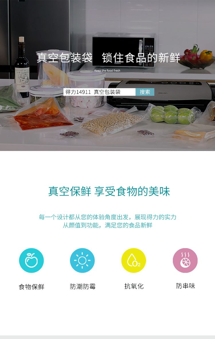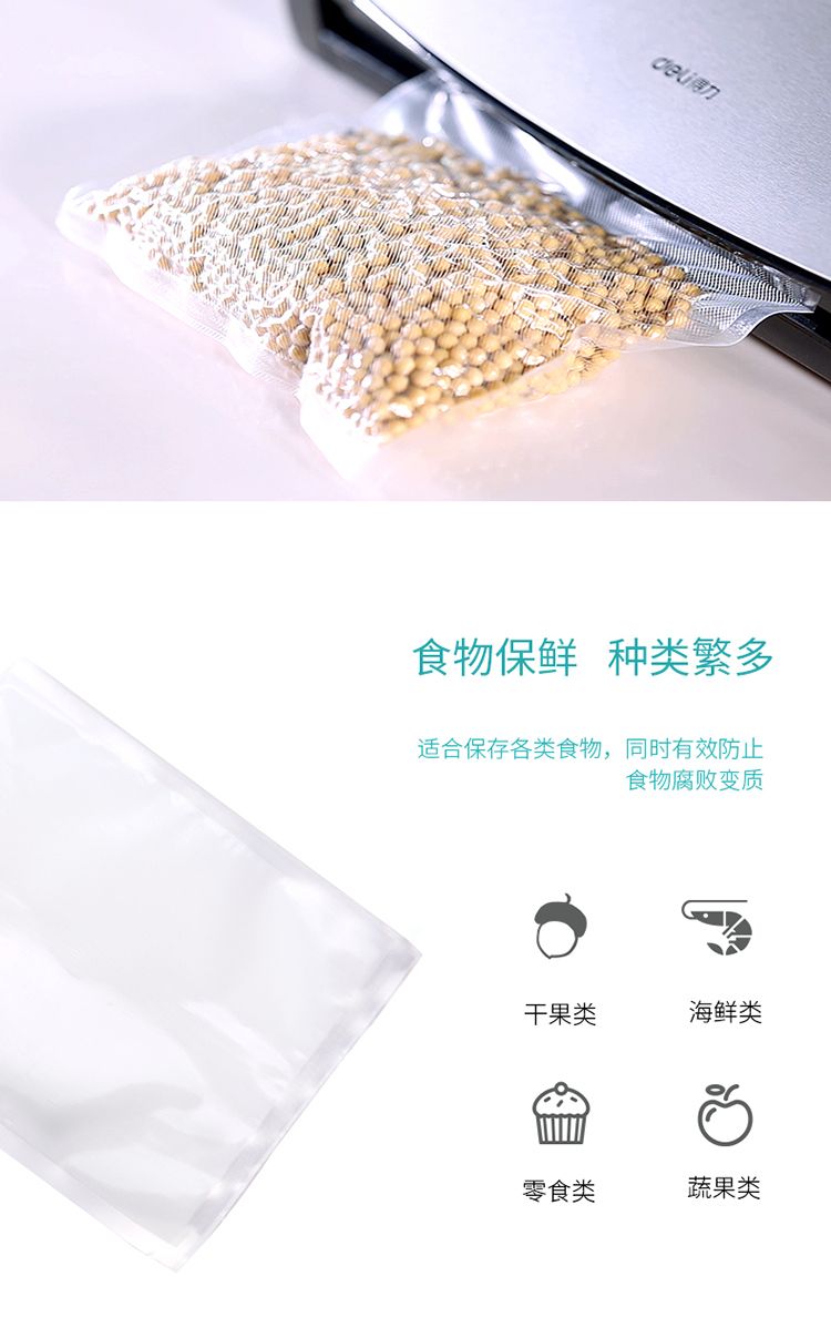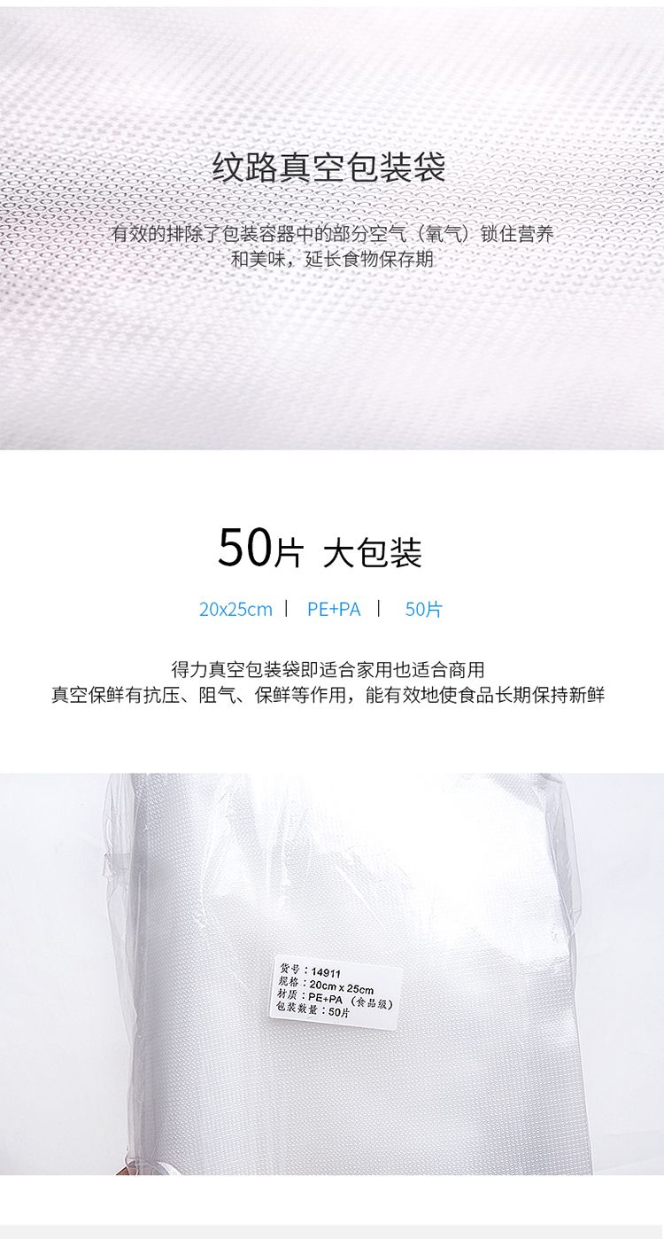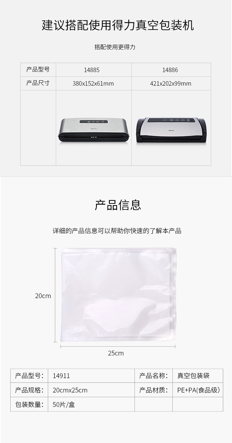 • 商品名称:得力(deli) 14911 真空包装袋单面纹路5米卷 20*25CM 50片/盒