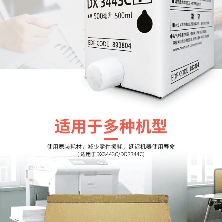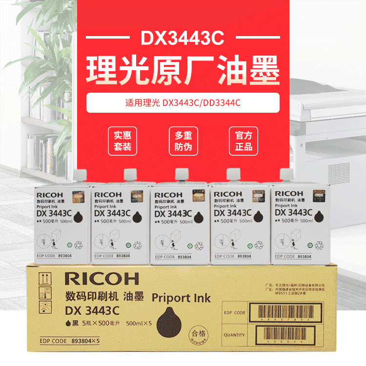 • 商品名称:理光(Ricoh)DX3443C 500cc/瓶 黑油墨 适用于DX3443C/DD3344C