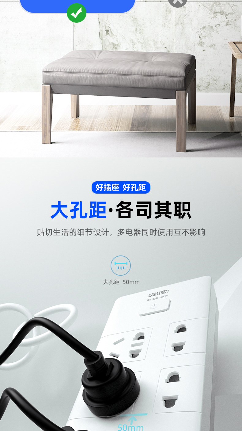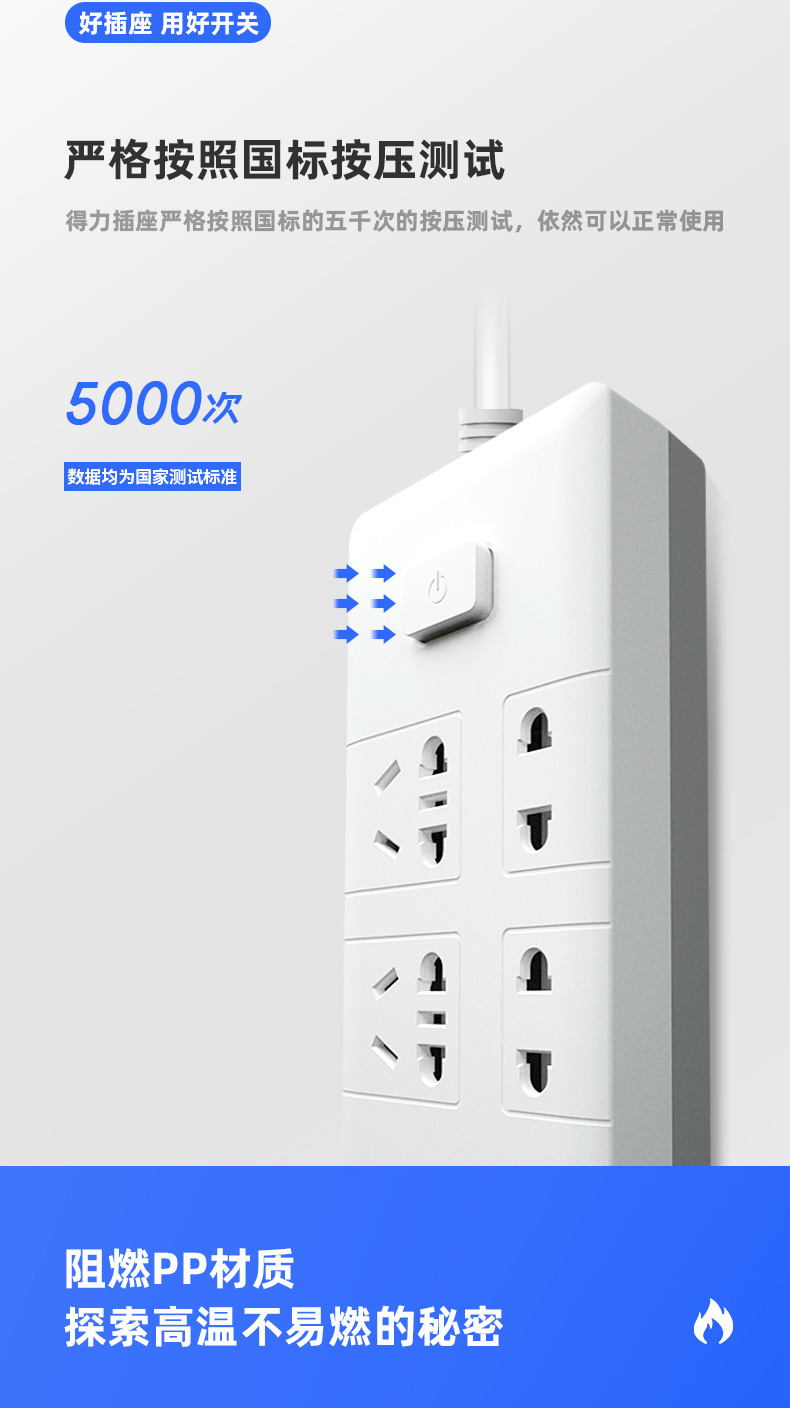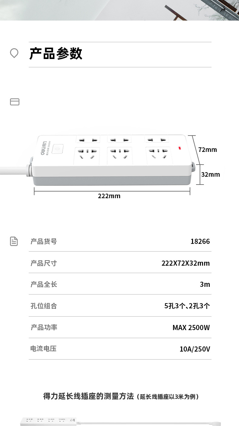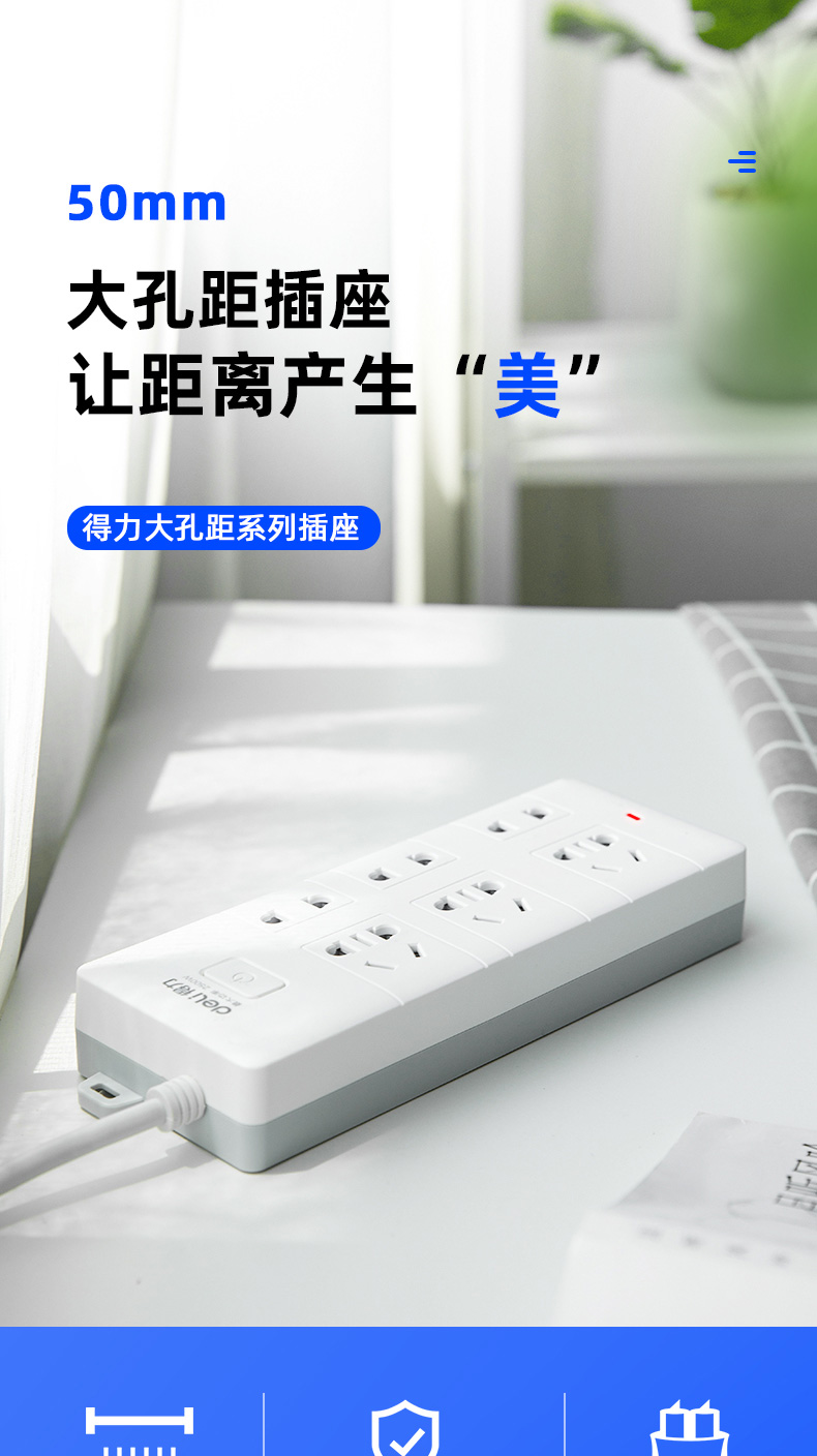 • 商品名称:得力(deli)18266 插座 插排/插线板/接线板/排插/拖线板 新国标 50mm大孔距 6位孔3米 总控开关