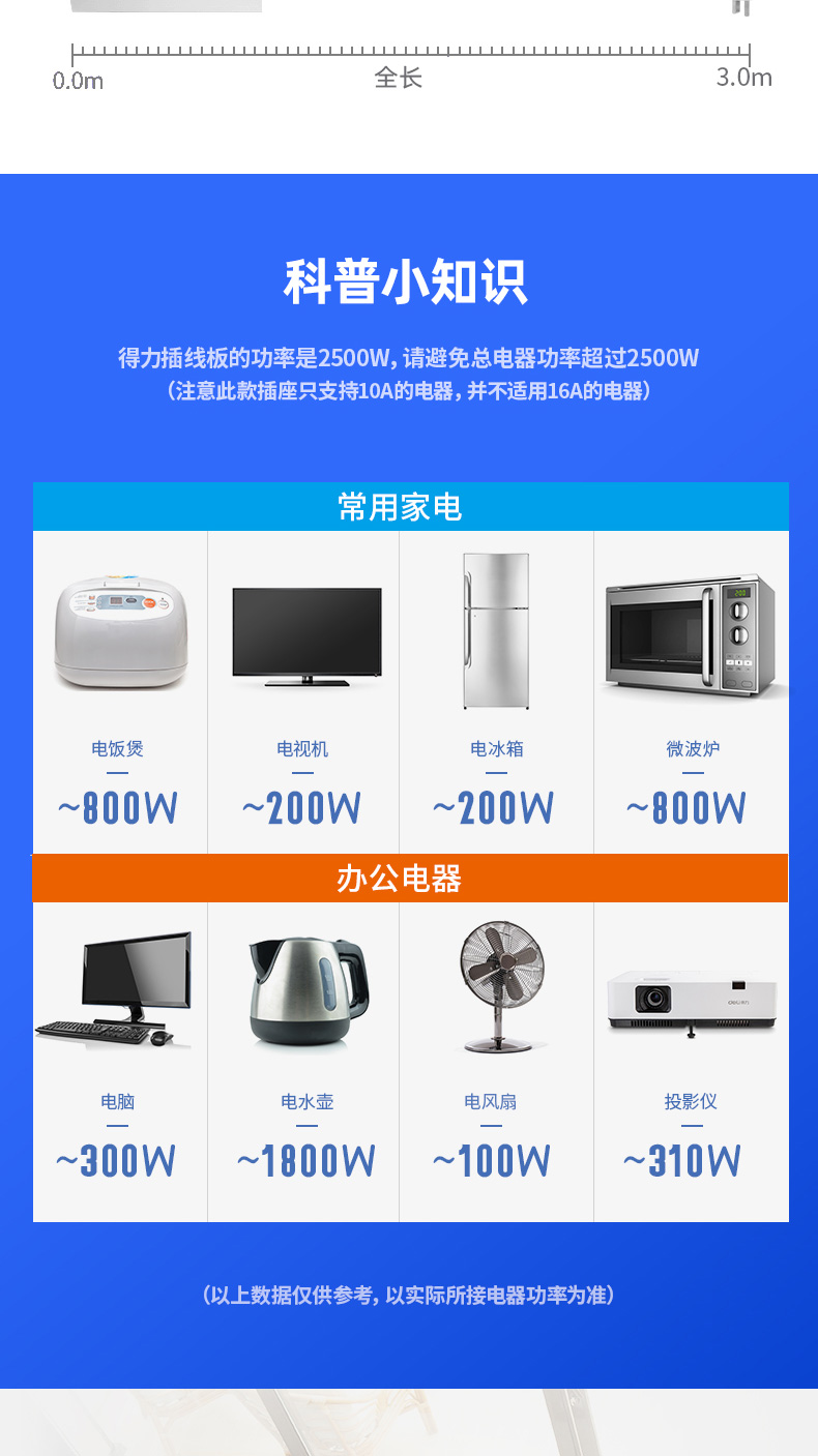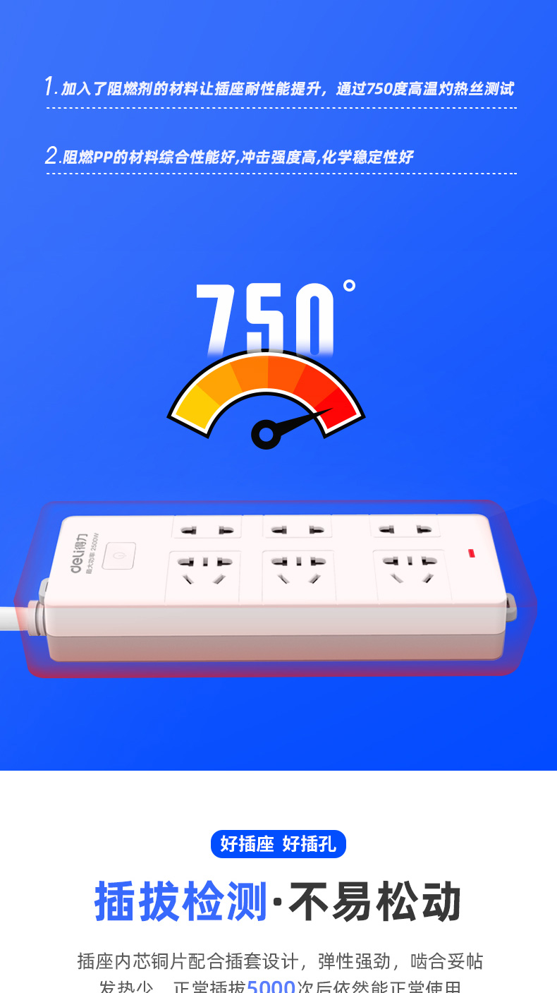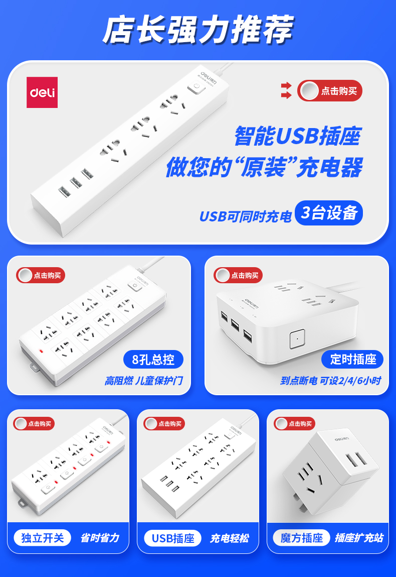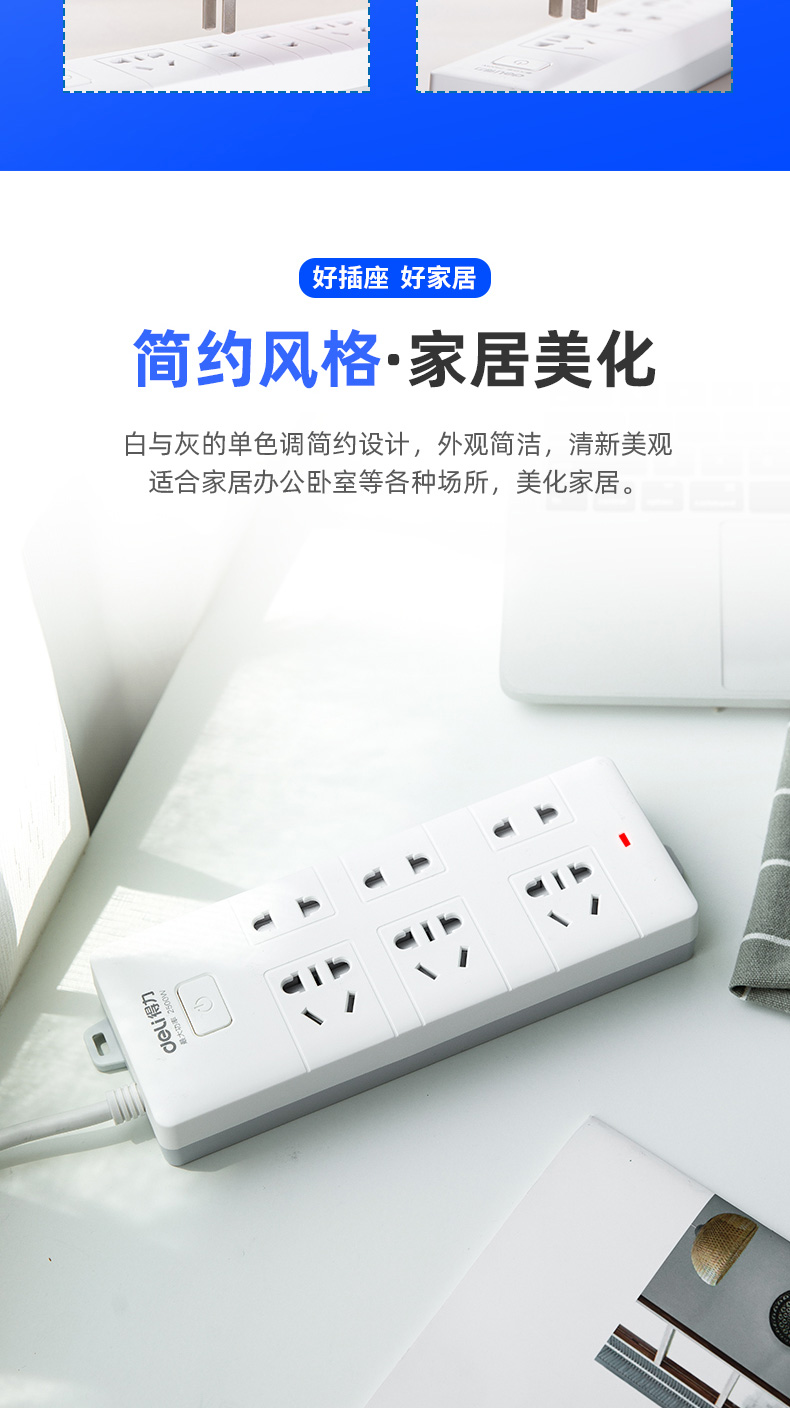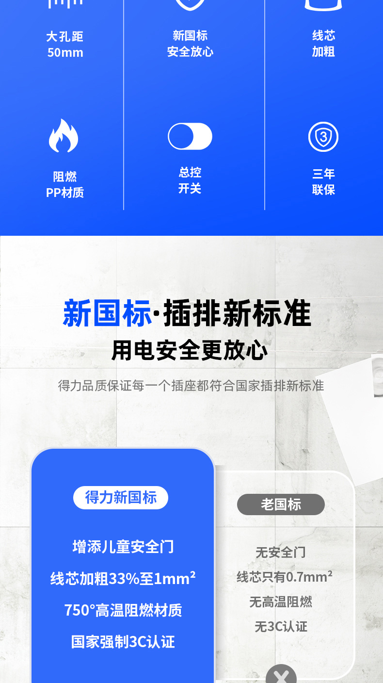 • 商品名称:得力(deli)18266 插座 插排/插线板/接线板/排插/拖线板 新国标 50mm大孔距 6位孔3米 总控开关