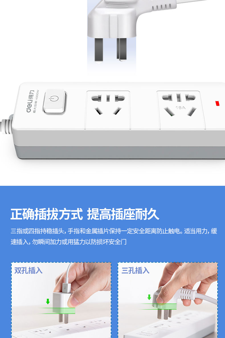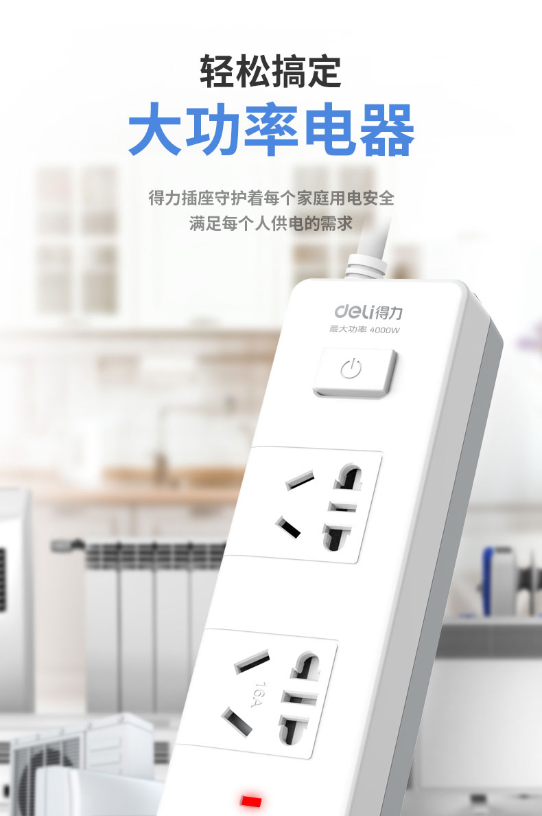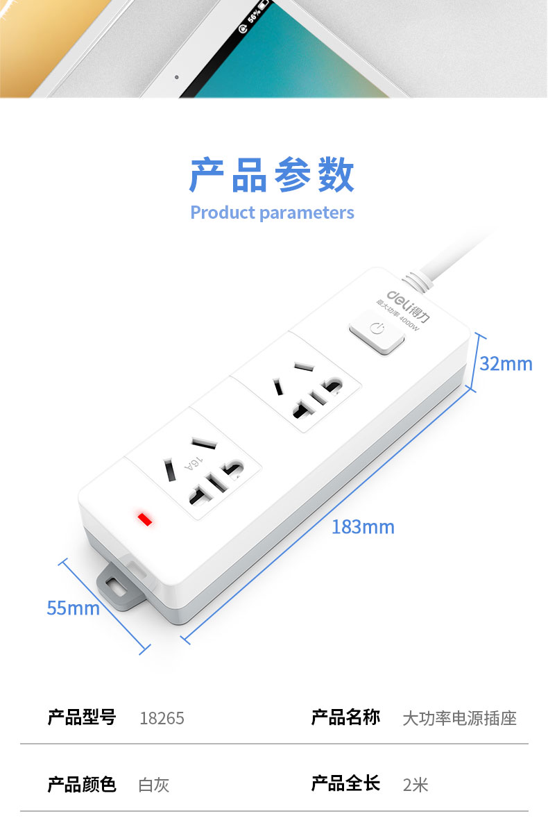 • 商品名称:得力(deli)18265 16A大功率插座/插排/插线板/排插/接线板 2位2米 总控开关