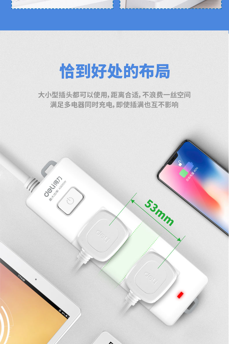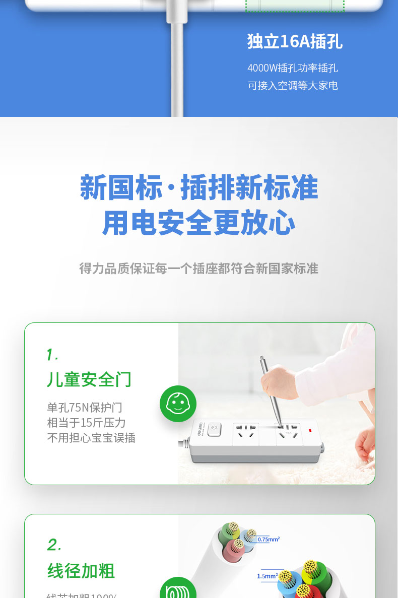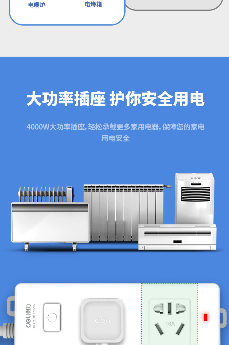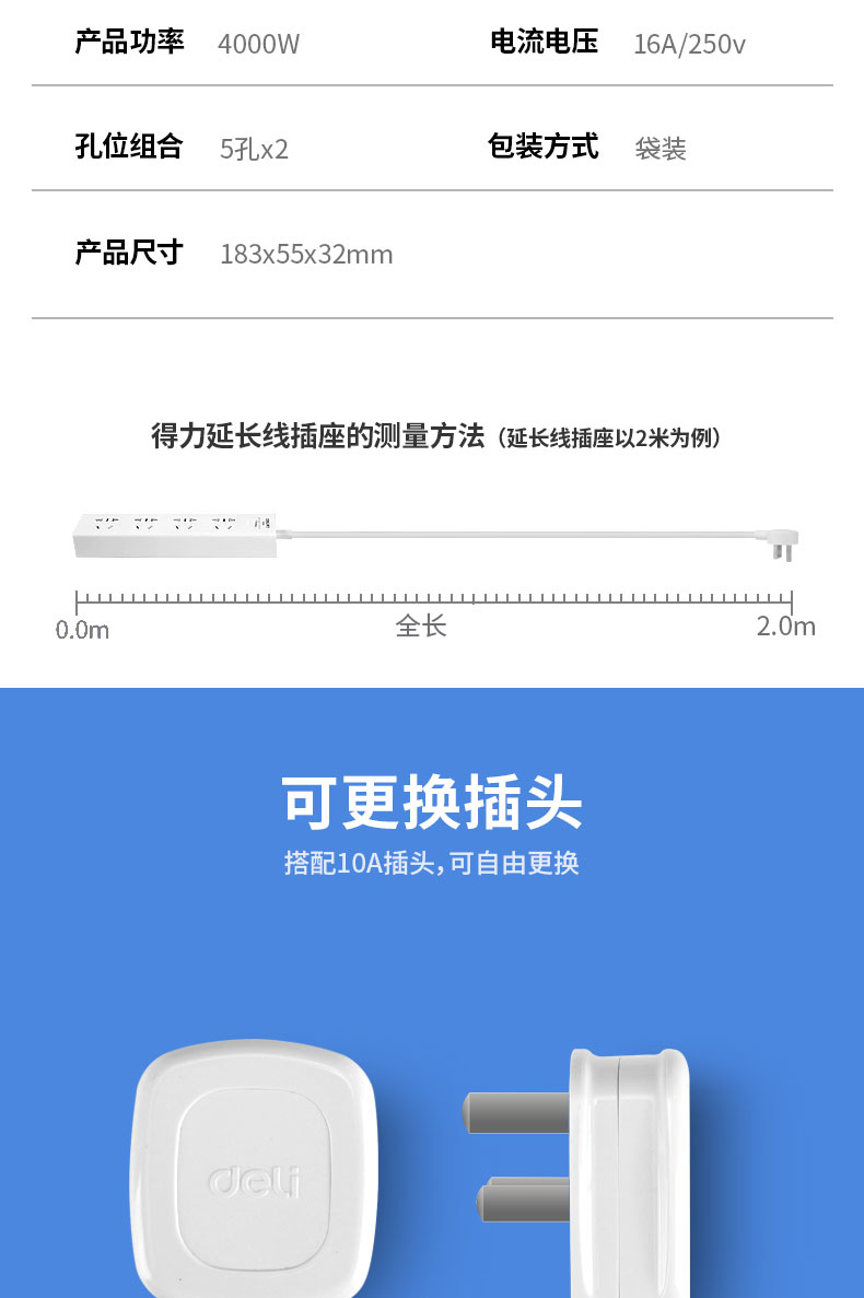 • 商品名称:得力(deli)18265 16A大功率插座/插排/插线板/排插/接线板 2位2米 总控开关