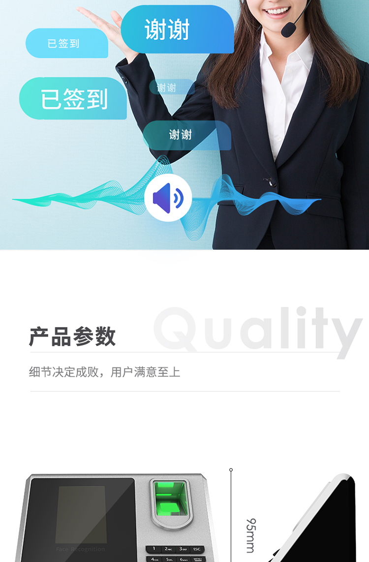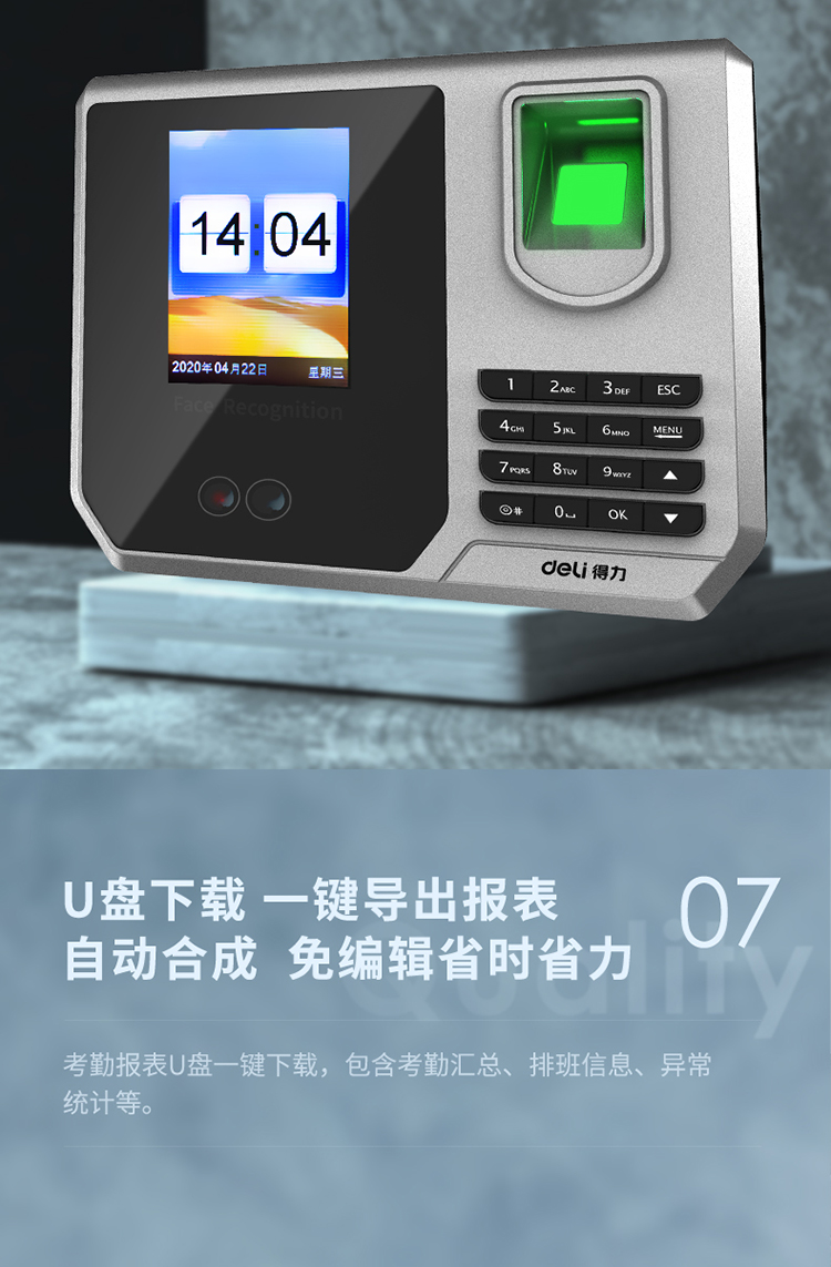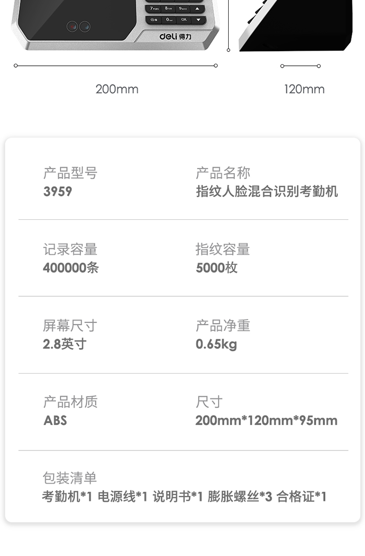 • 商品名称:得力(deli) 3959 指纹加人脸识别考勤机 混合识别打卡机