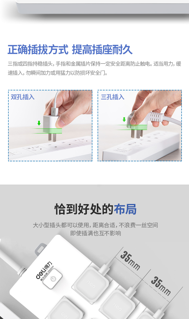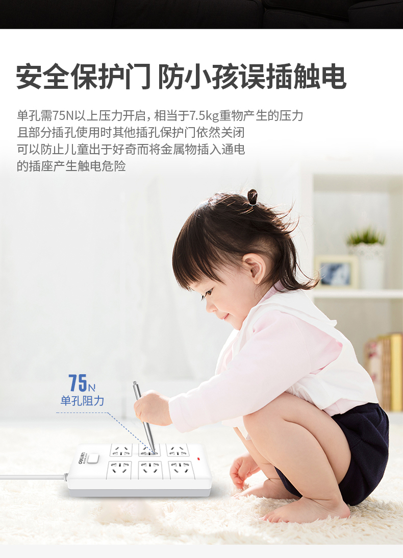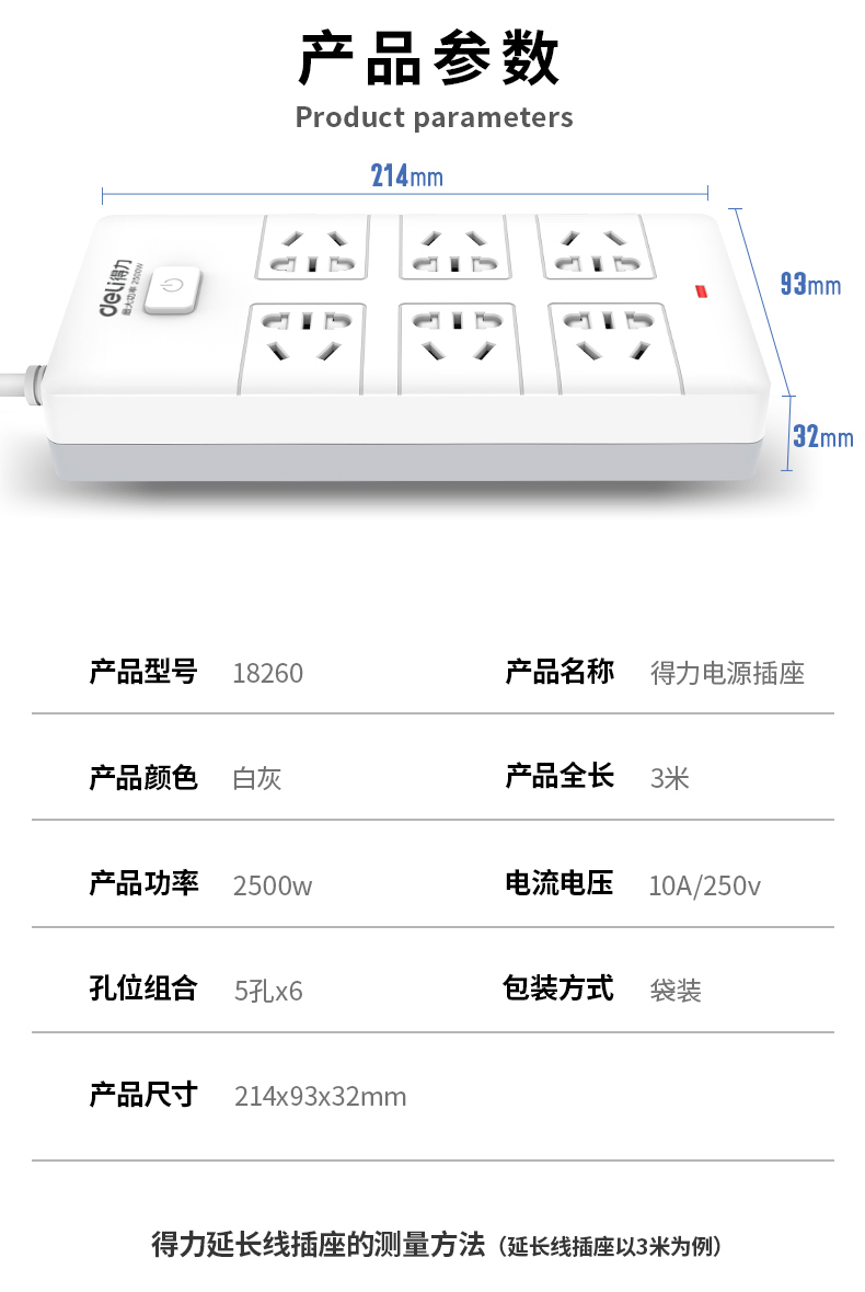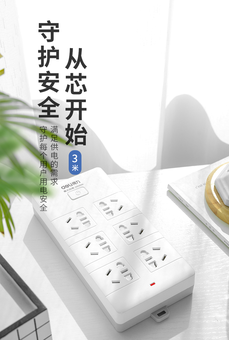 • 商品名称:得力(deli) 18260 新国标安全插座/插排/插线板/接线板/排插/拖线板 总控开关 儿童保护门 6组合孔3米