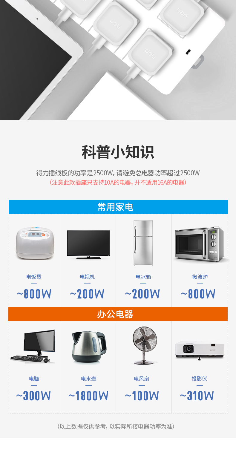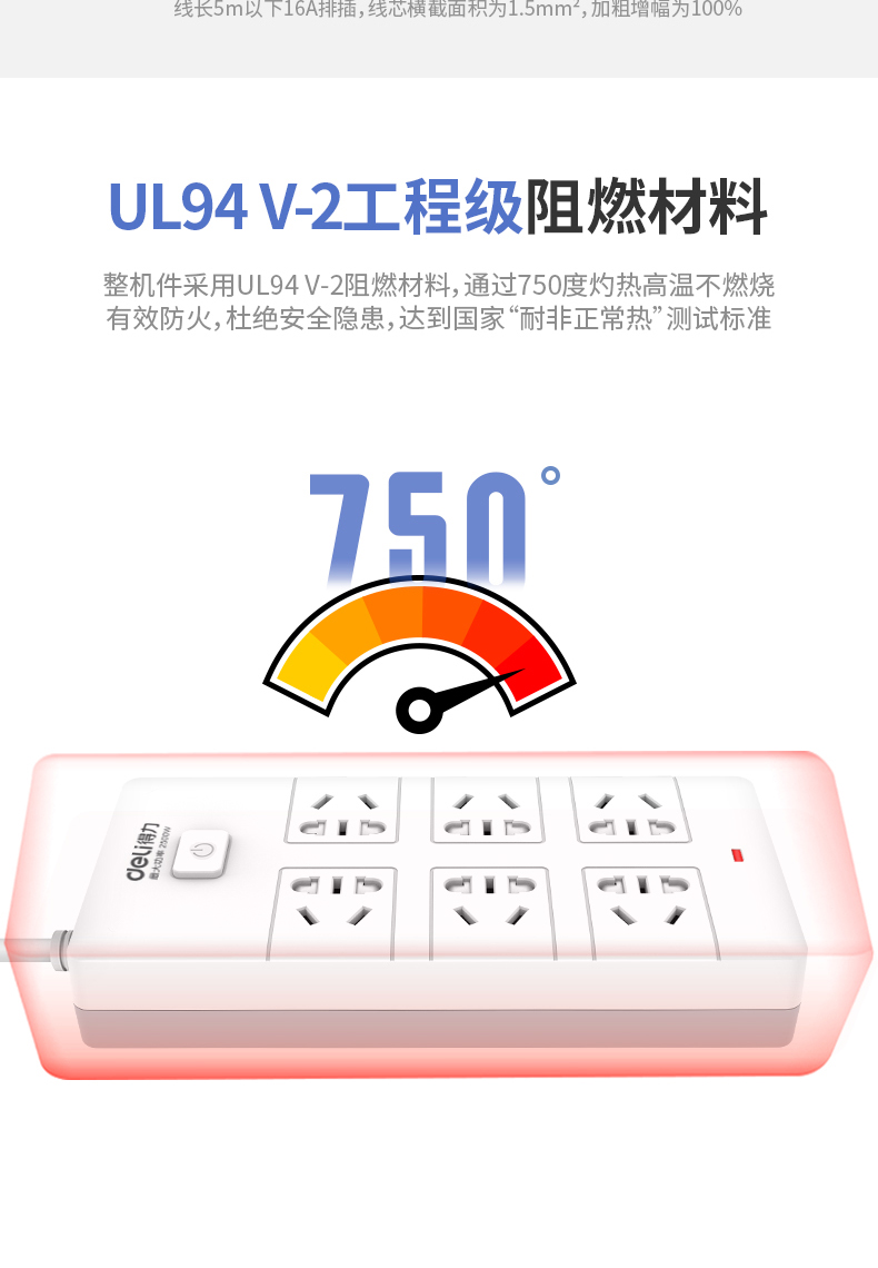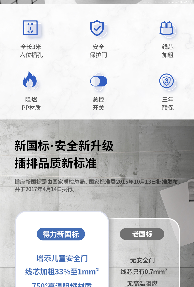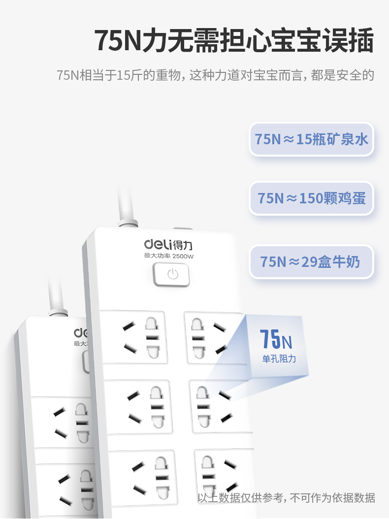 • 商品名称:得力(deli) 18260 新国标安全插座/插排/插线板/接线板/排插/拖线板 总控开关 儿童保护门 6组合孔3米