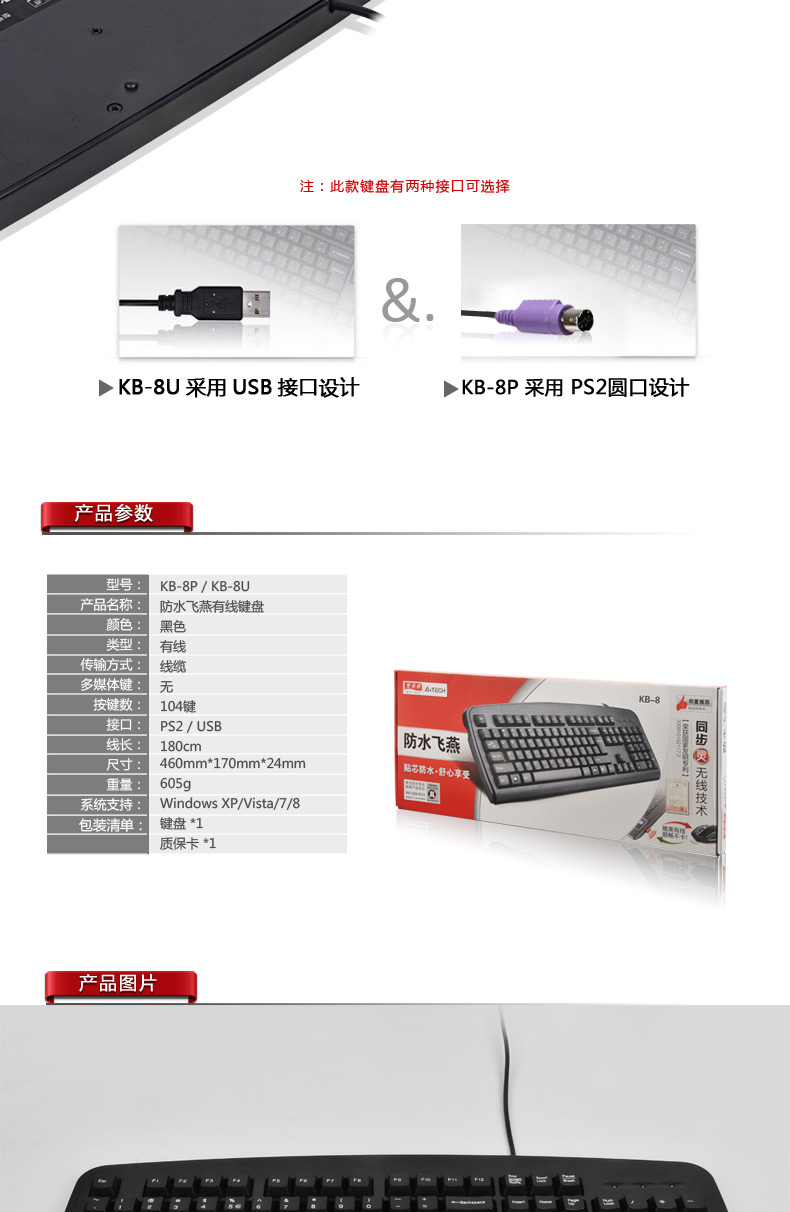 • 商品名称:双飞燕(A4TECH) KB-8PS2 键盘 有线 防水 PS2圆头接口 黑色