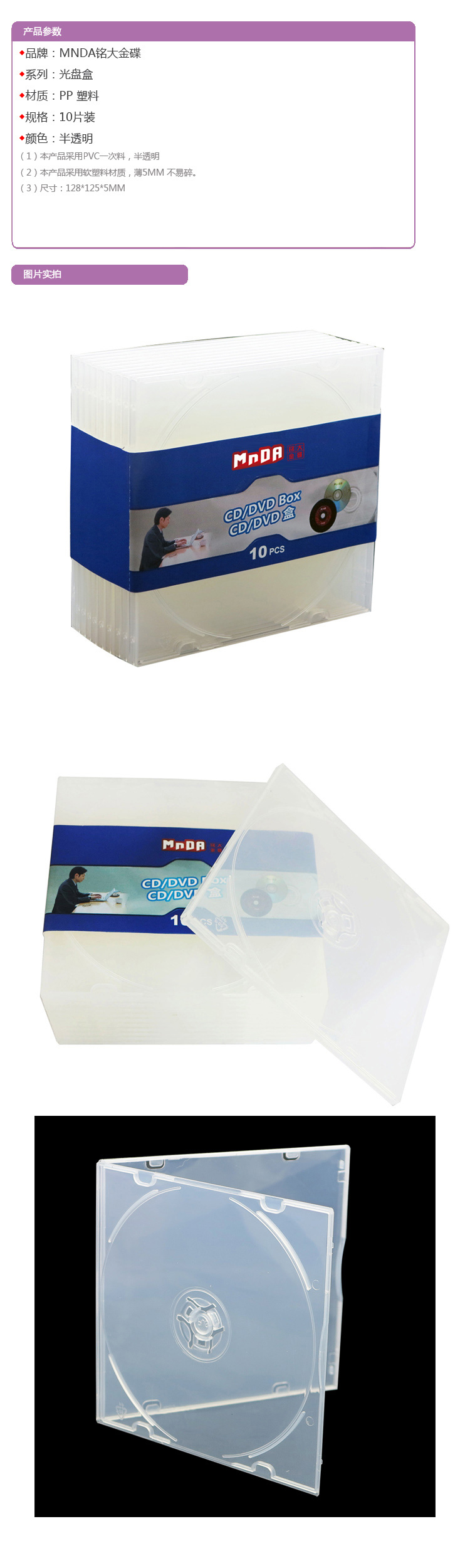 • 商品名称:铭大金碟(MNDA)单片装 CD盒 光盘盒 柔韧设计不易碎 128*125*5mm 10片/包