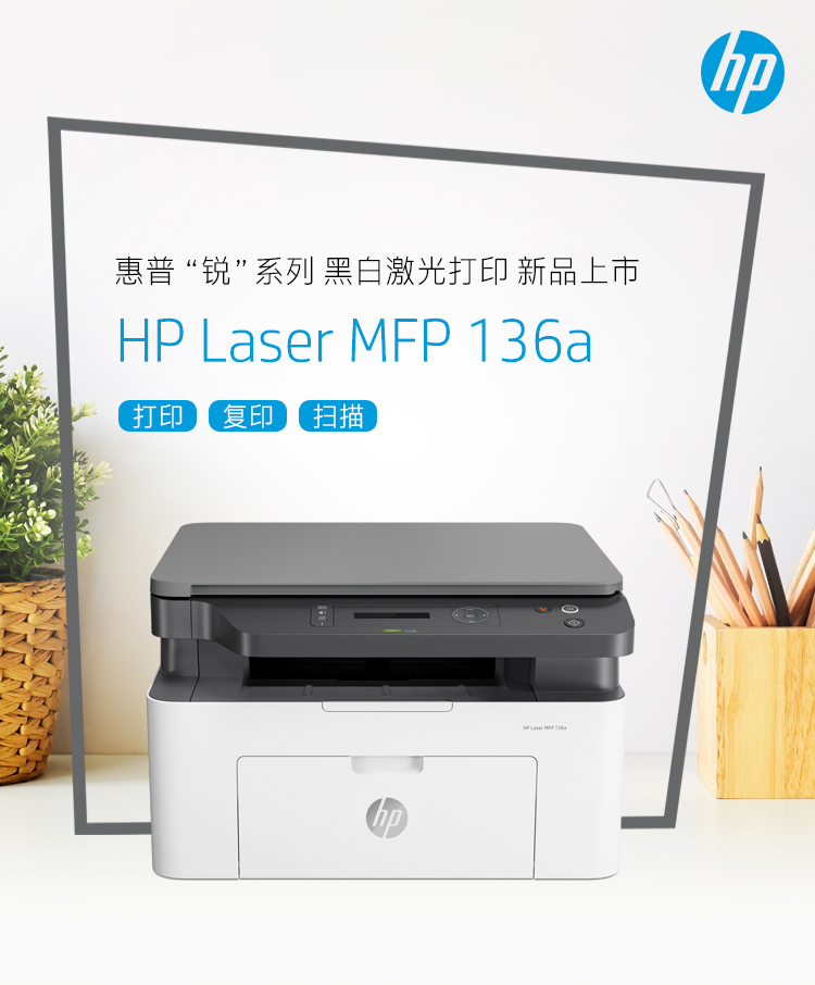 • 商品名称:惠普 (HP) 136a 锐系列A4黑白激光多功能一体机 三合一打印复印扫描