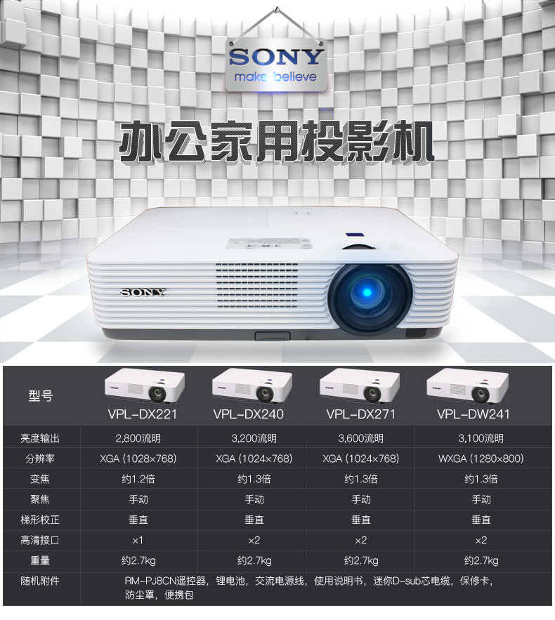 • 商品名称:索尼(SONY)VPL-DX241 投影仪 办公便携 高清会议投影机(3300流明 标清)