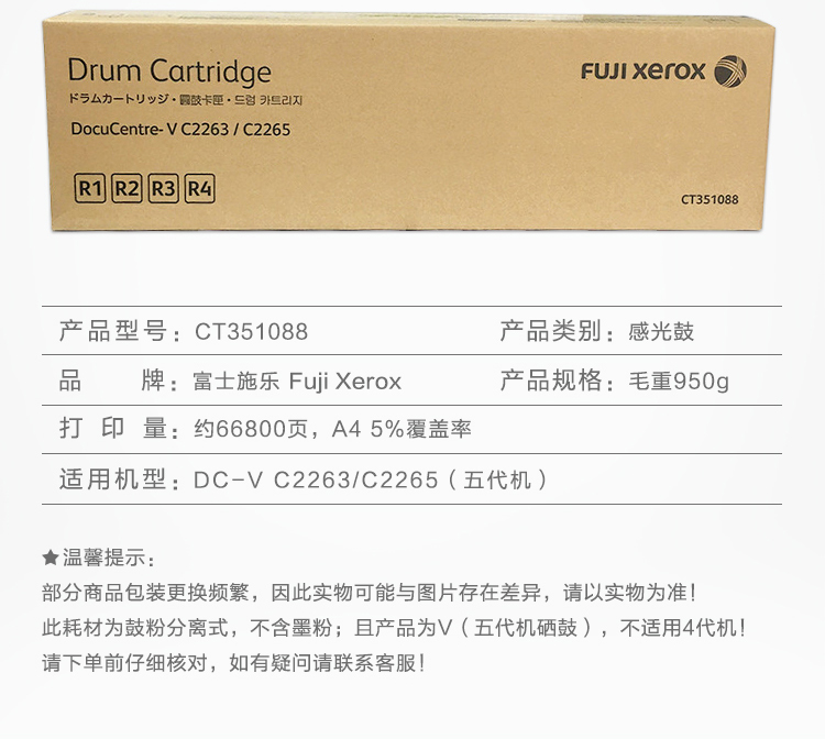 • 商品名称:富士施乐(FujiXerox) CT351088 五代感光鼓硒鼓四色通用 适用于施乐VC2263/C2265 约67000页