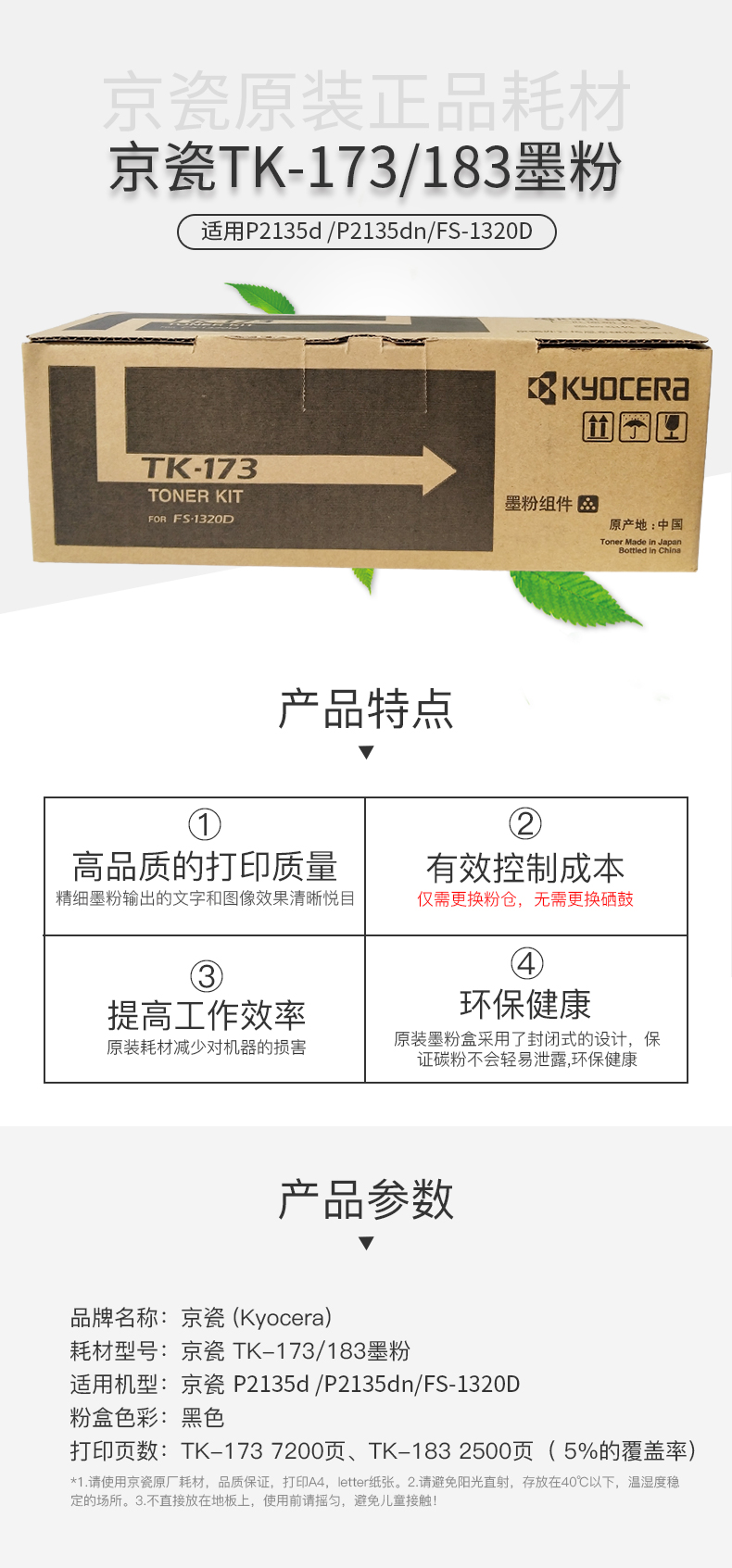 • 商品名称:京瓷(KYOCERA)TK-173 碳粉墨粉 适用于京瓷P2135dn/FS-1320d 约7200页