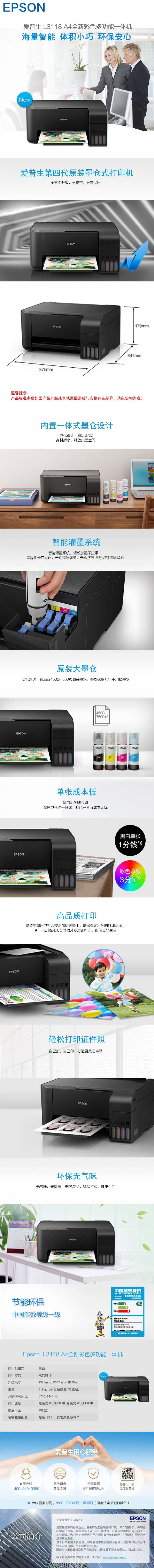 • 商品名称:爱普生(EPSON)L3118 A4彩色内置墨仓式一体机 (打印 复印 扫描 L380升级版)