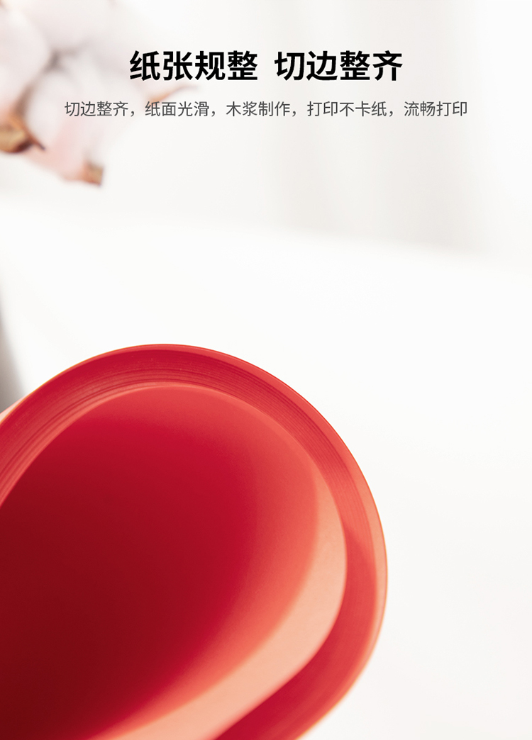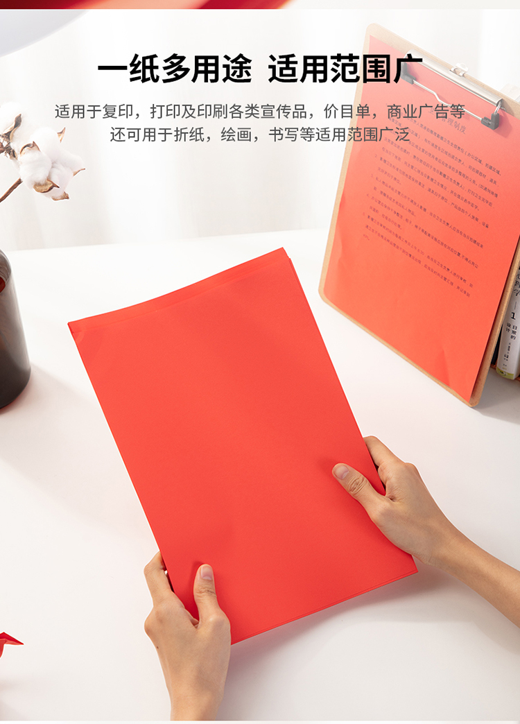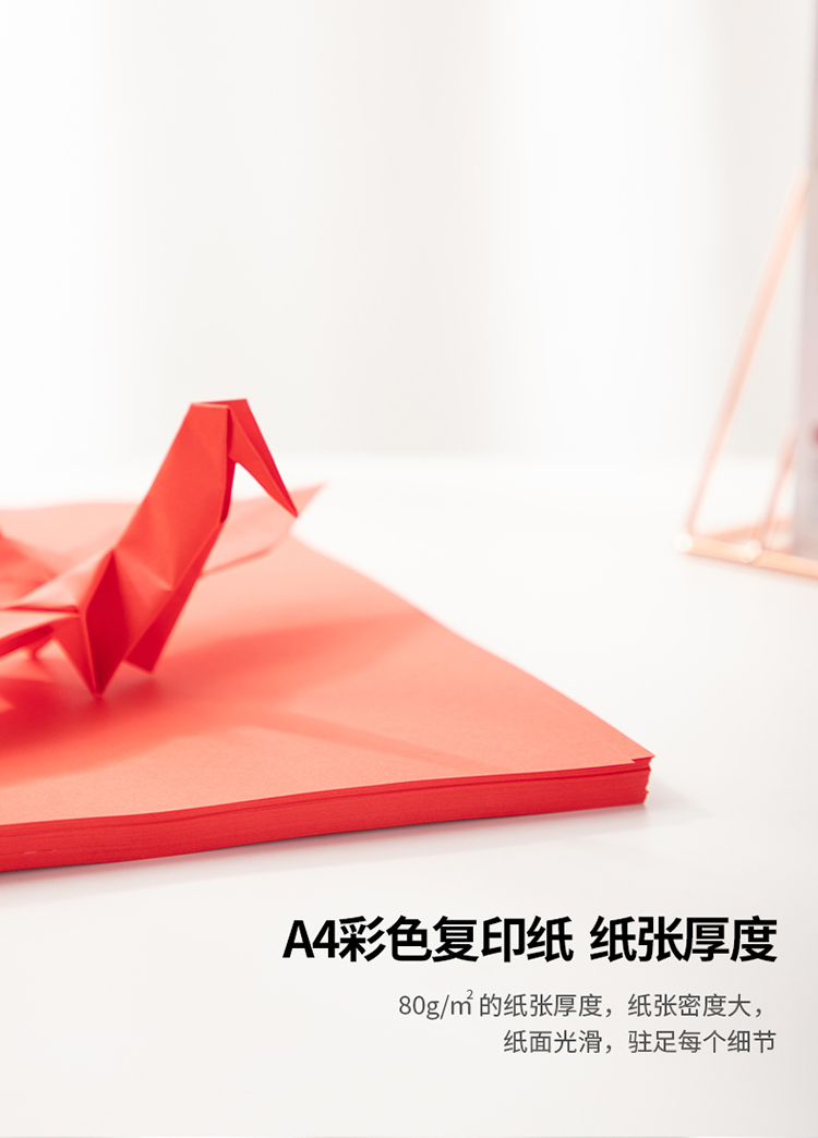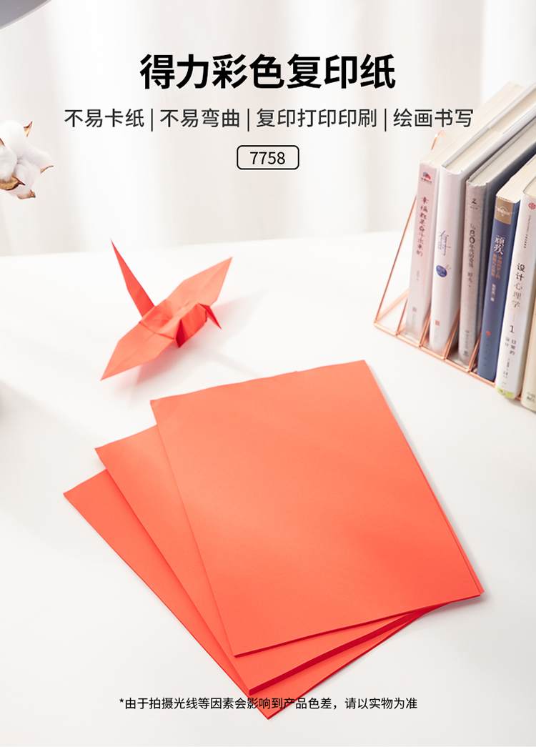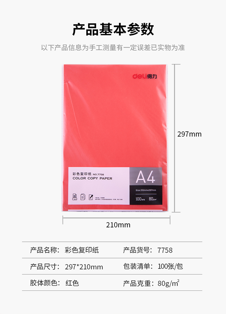 • 商品名称:得力(deli)7758 A4红色复印纸 彩色打印纸手工折纸卡纸 80g100张/包