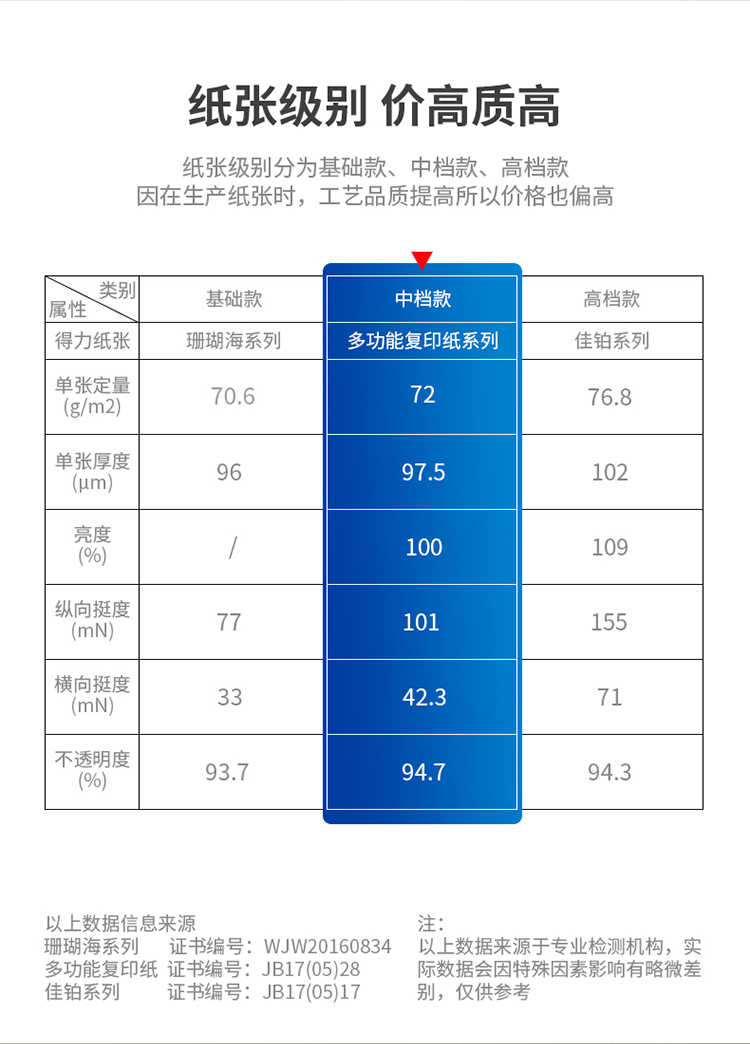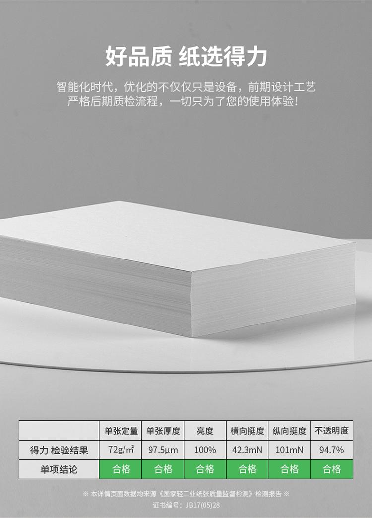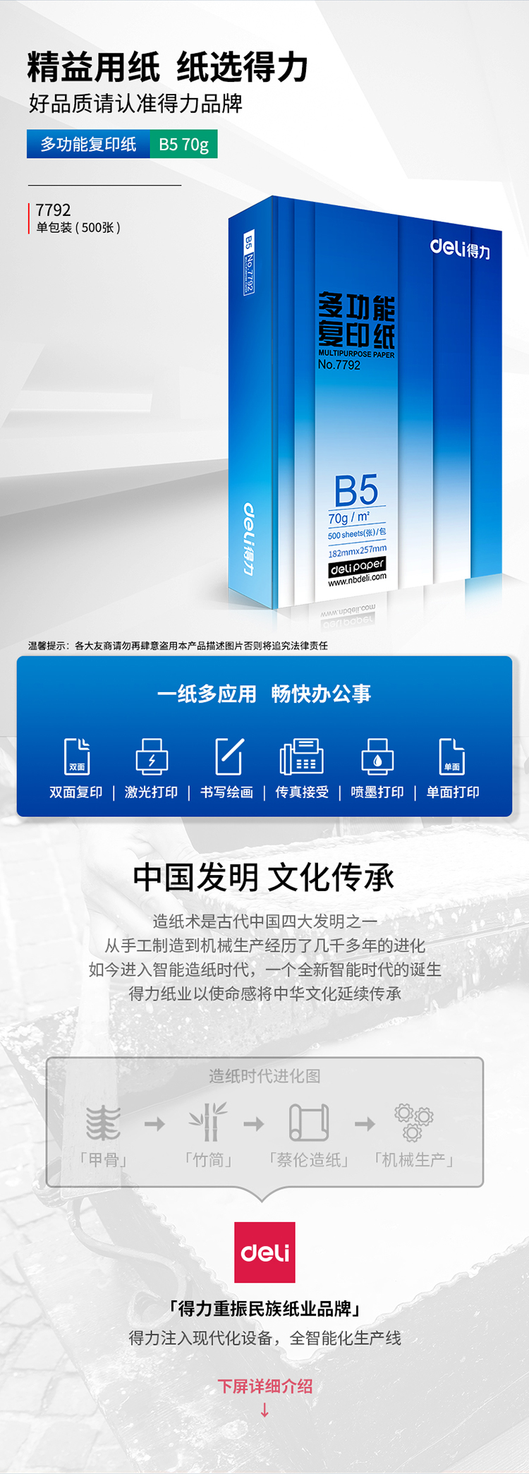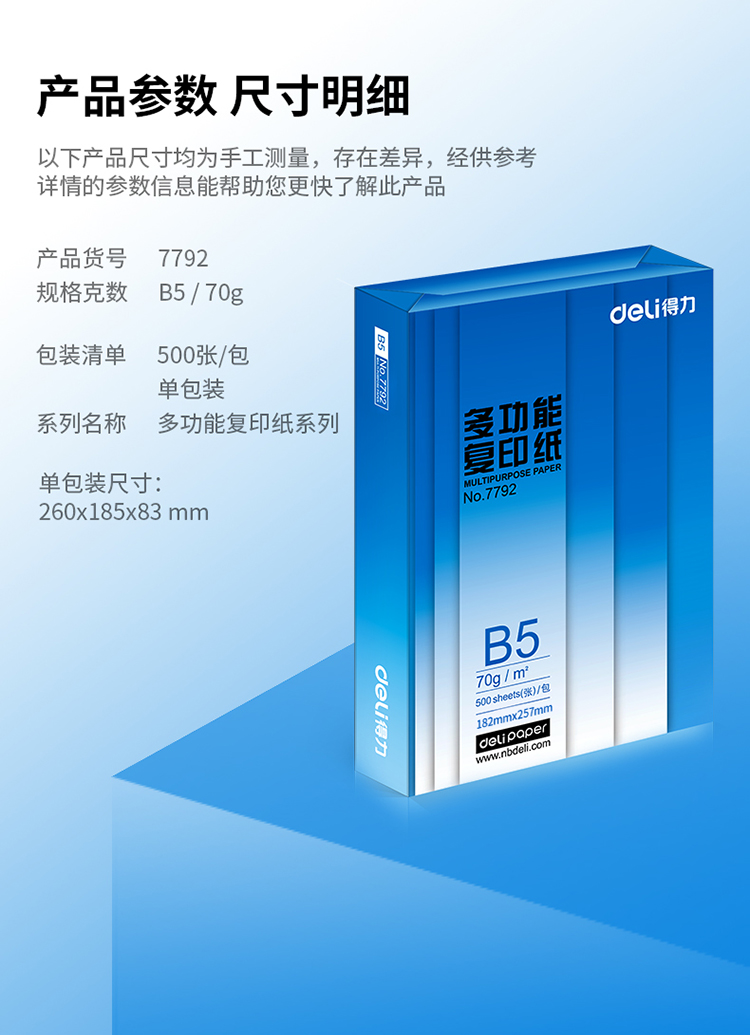 • 商品名称:得力(deli)7792 莱茵河B5复印纸 70g 500张/包