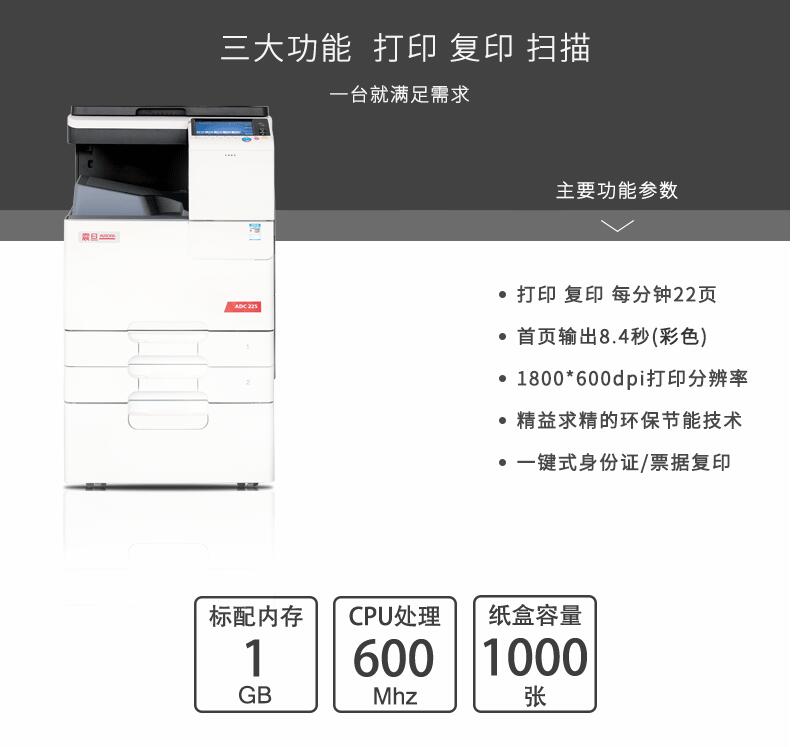 • 商品名称:震旦(AURORA) ADC225 A3数码彩色复合机 多功能智能复印机 标配双面器/双面输稿器
