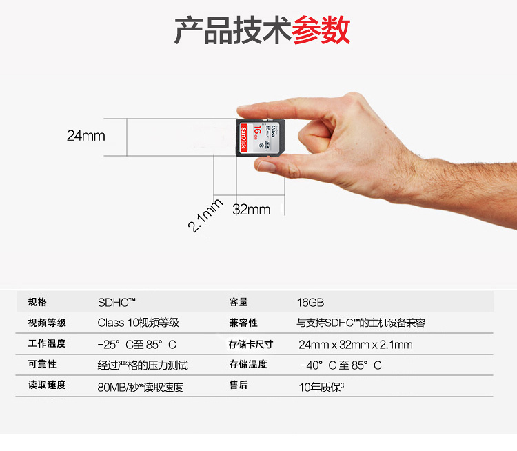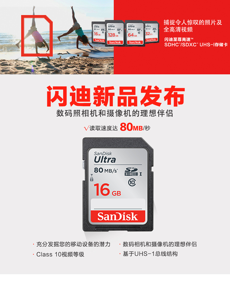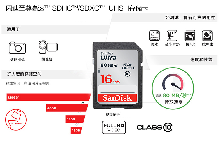 • 商品名称:闪迪(SanDisk) SD卡至尊高速 16GB SDUNC 读速80MB/s SDHC UHS-I存储卡 class10