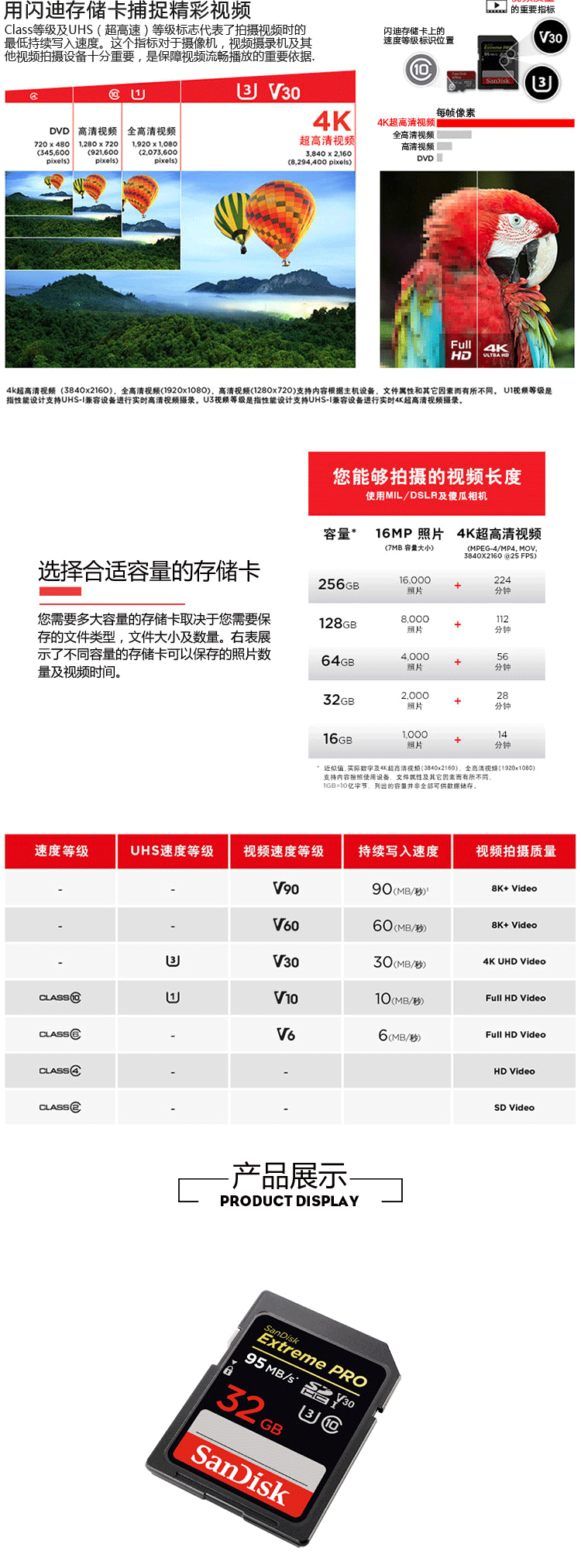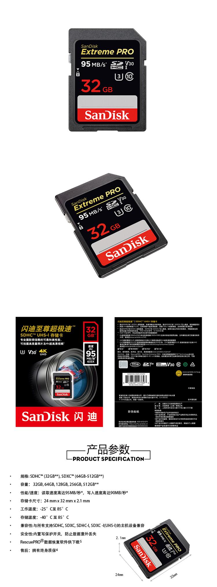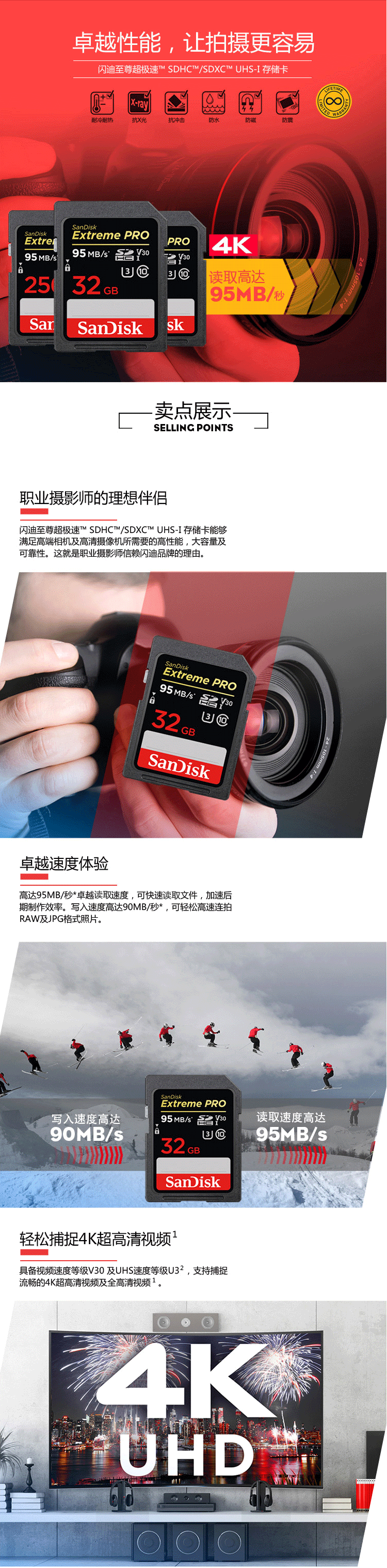 • 商品名称:闪迪(SanDisk) SD卡至尊超极速版 32G SDXXG 95M 读速95MB/s 写速90MB/s 捕捉4K超高清