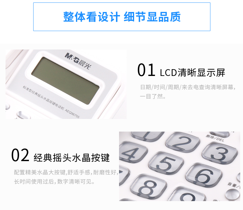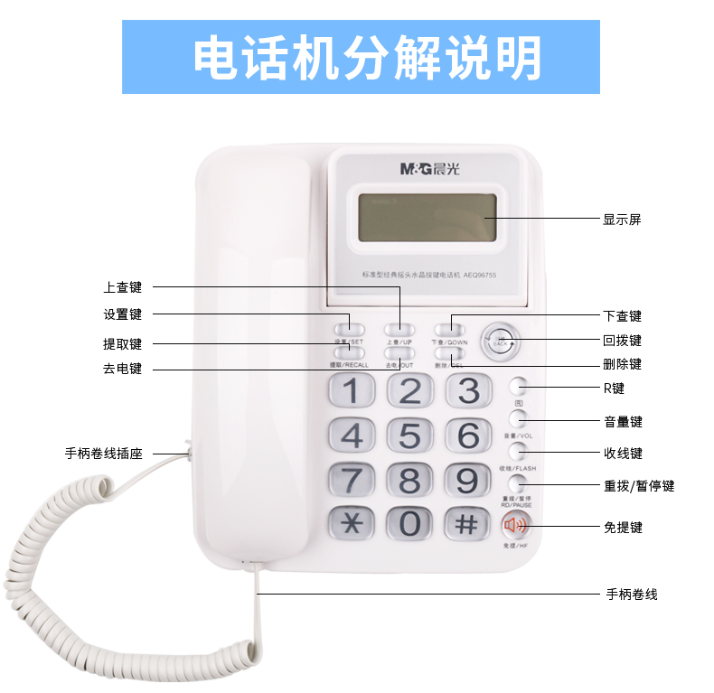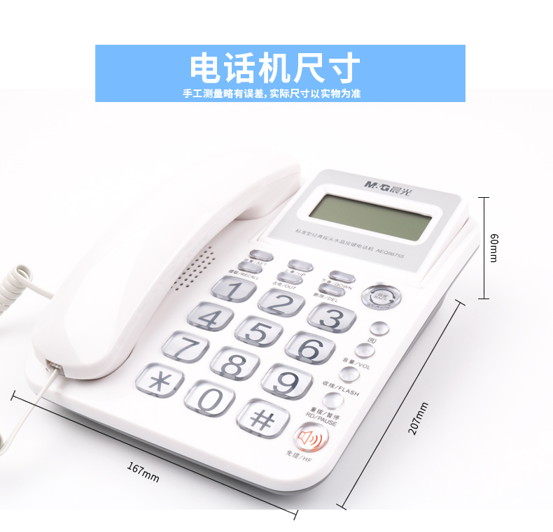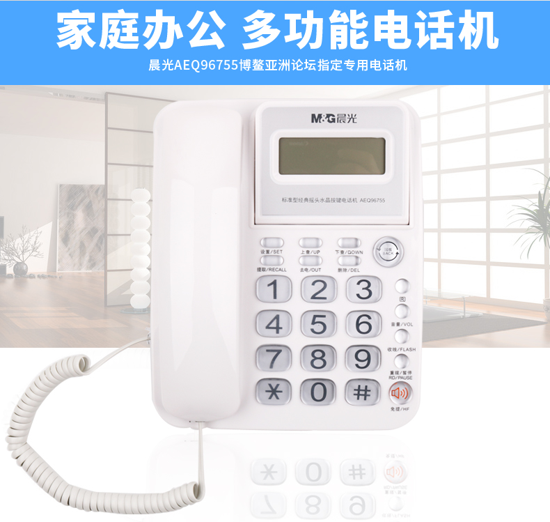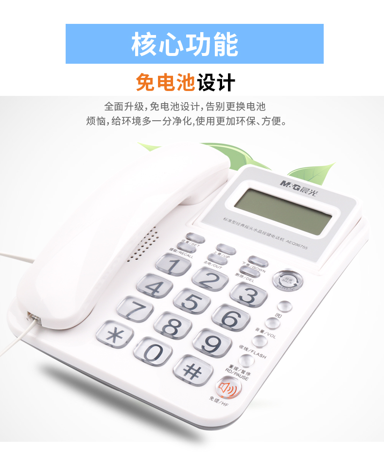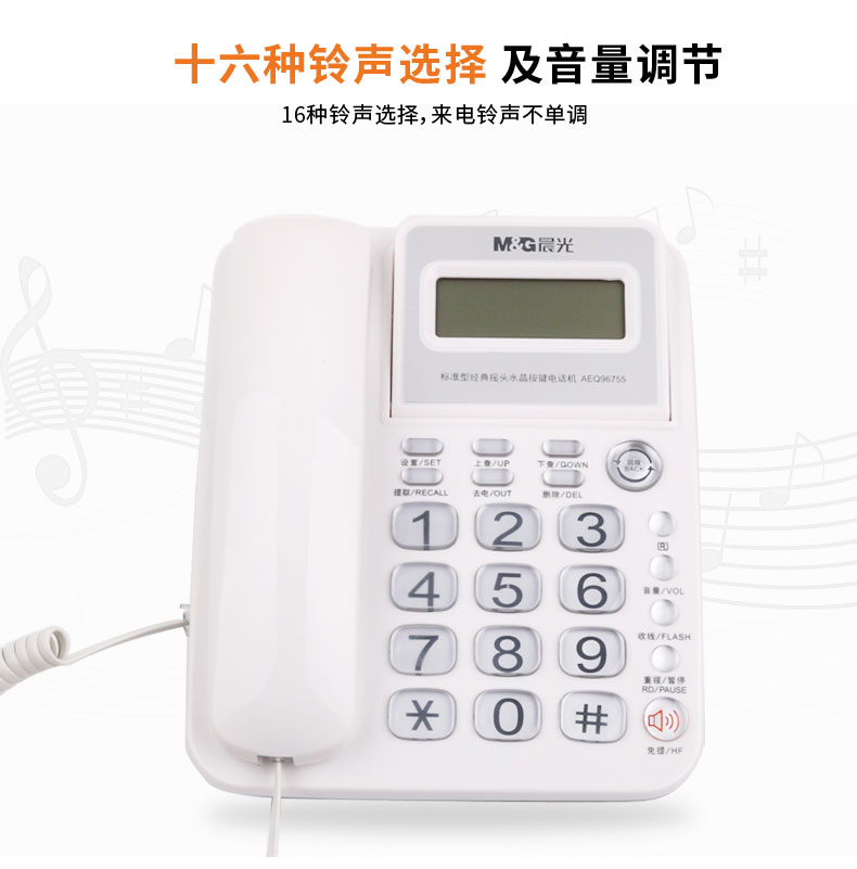 • 商品名称:晨光(M&G) AEQ96755 有线固定电话机 座机固话座式家庭办公免电池商务来电显示 (白色)