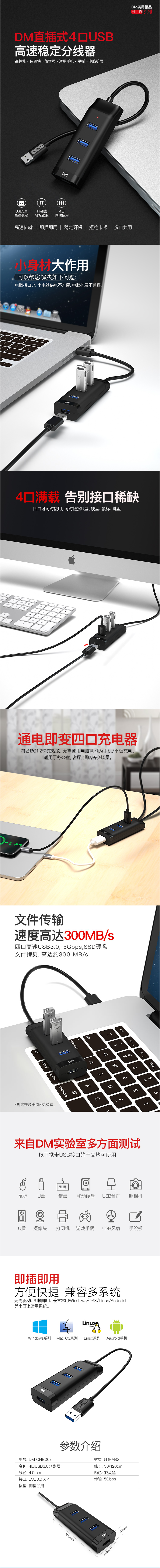 • 商品名称:大迈(DM) CHB007 USB分线器USB3.0 HUB集线器高速扩展一拖四口 笔记本电脑4口HUB转换器延长线(30CM)