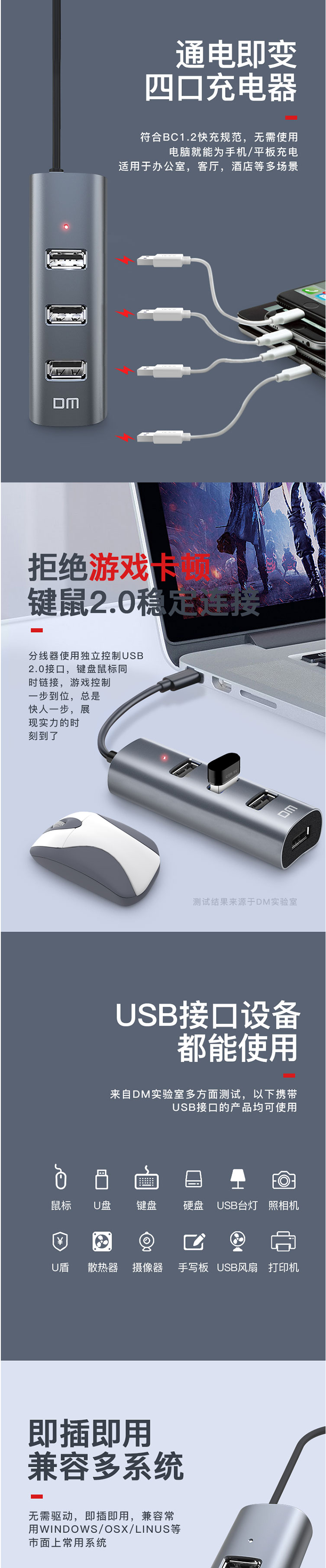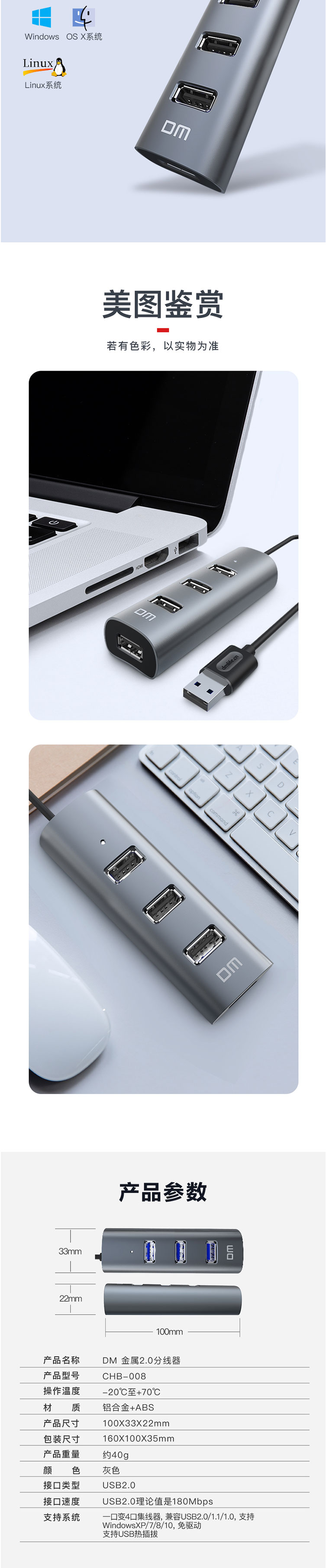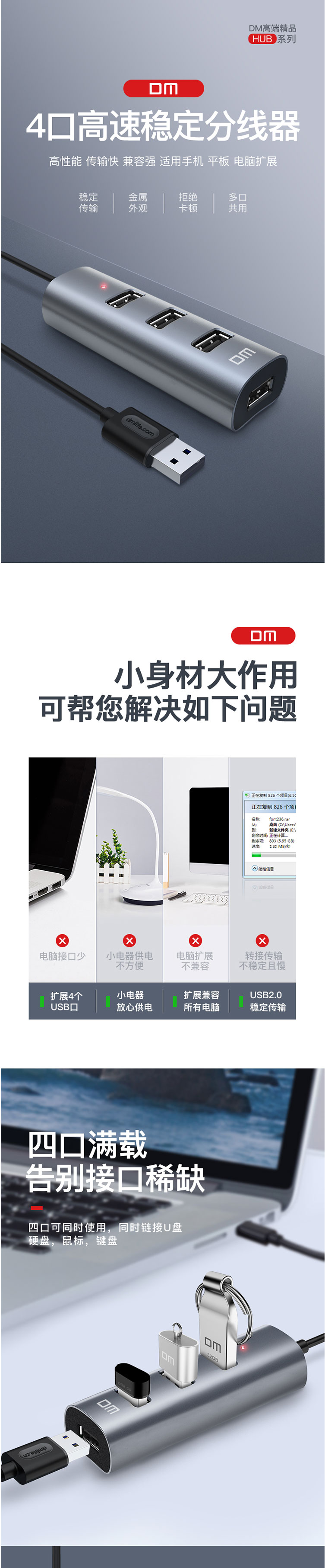 • 商品名称:大迈(DM) CHB008 USB分线器 USB2.0 4口HUB 铝合金 笔记本台式电脑4口金属集线器HUB转换器(30CM)