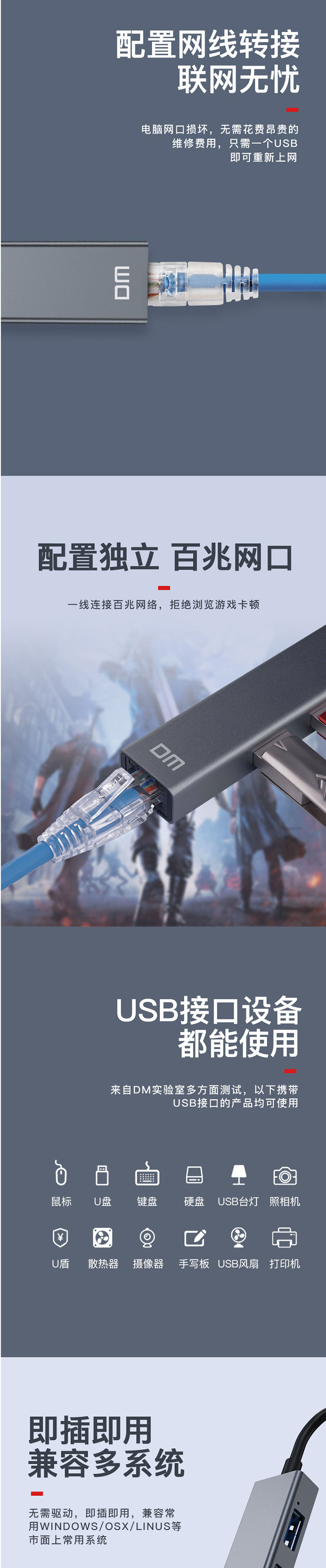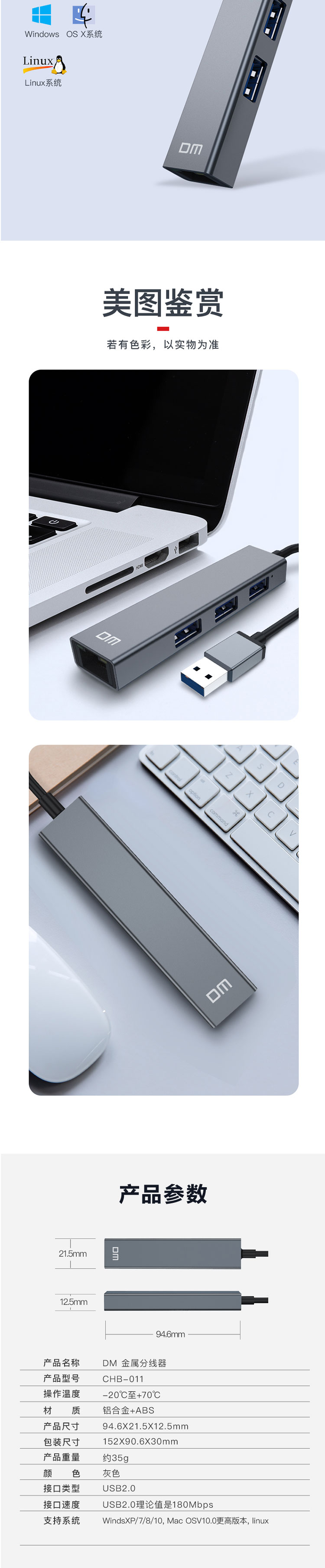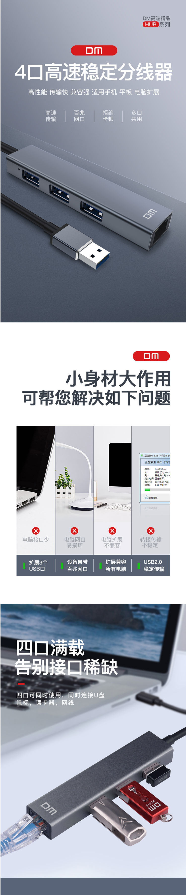 • 商品名称:大迈(DM) CHB011 CHB011 USB分线器 USB2.0 3口+百兆网口HUB USB转百兆网口网线转换器 有线网卡2.0扩展坞HUB集线器
