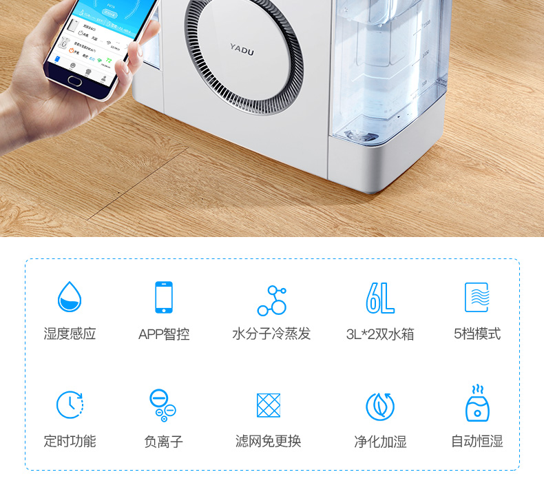 • 商品名称:亚都(YADU)SZK-J360WiFi 加湿器 6L大容量 无雾 感应恒湿 净化 静音办公室卧室家用智能加湿