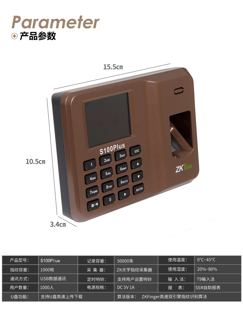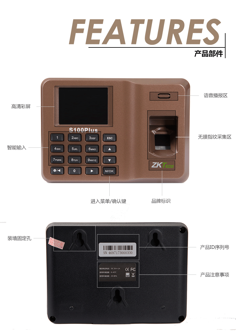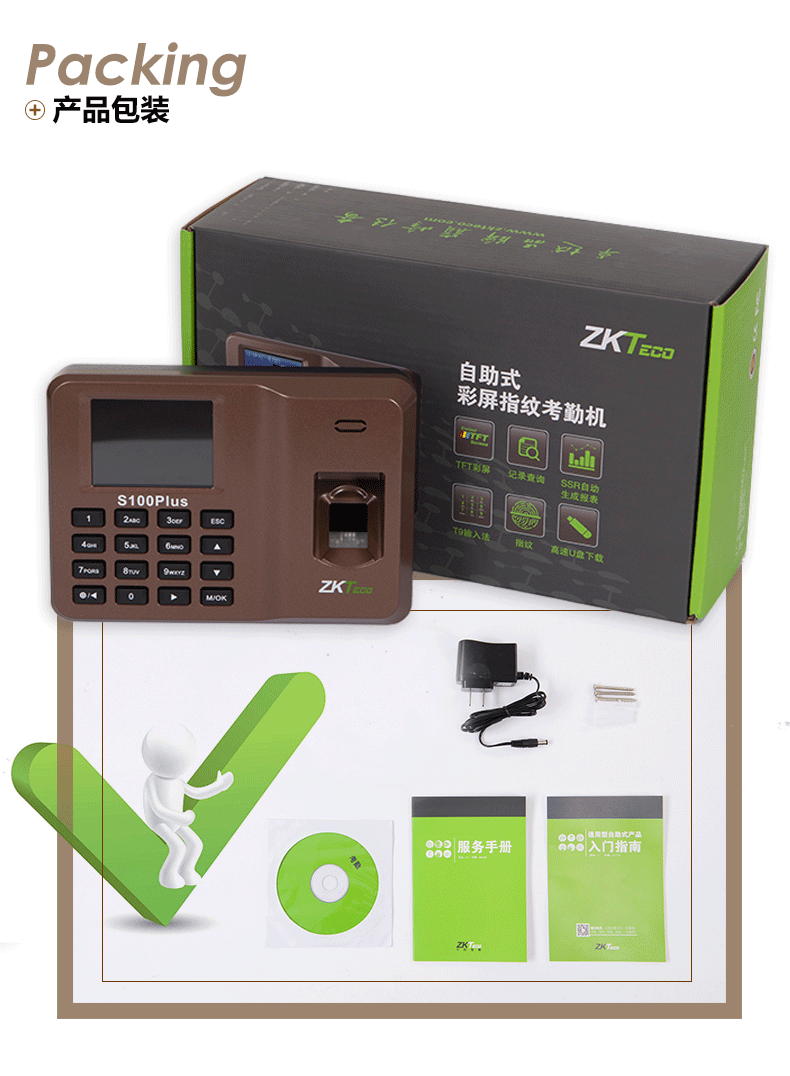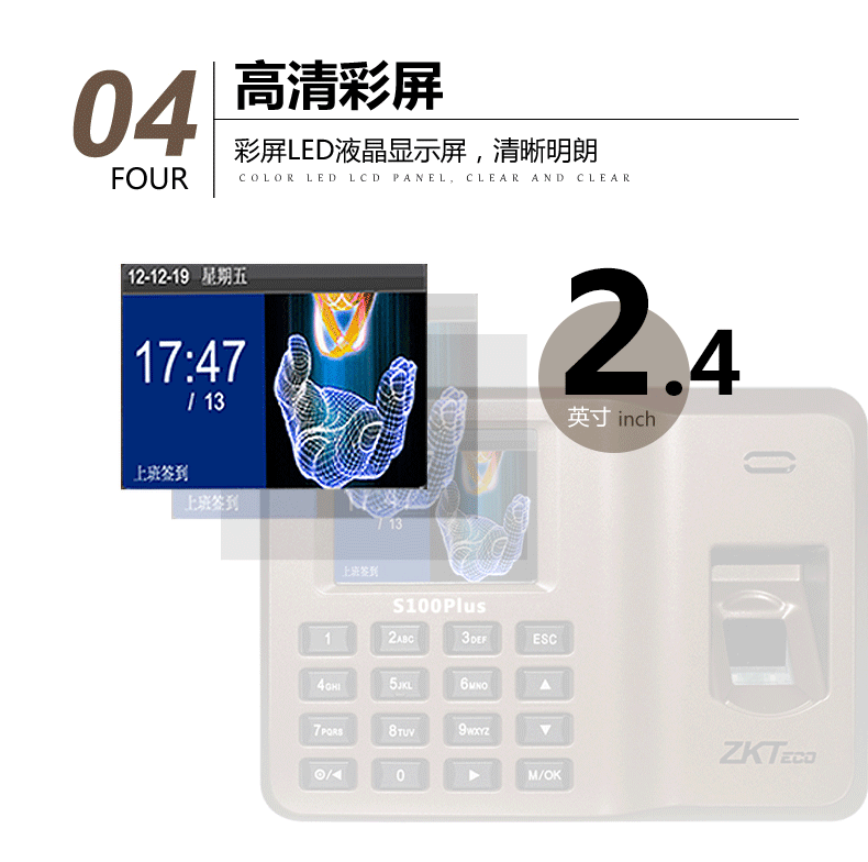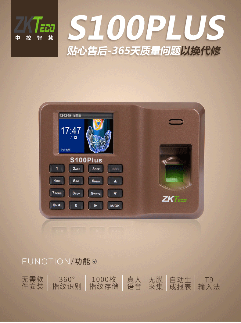 • 商品名称:中控智慧(ZKTeco) S100plus 考勤机 指纹打卡机上下班打卡签到指纹考勤机