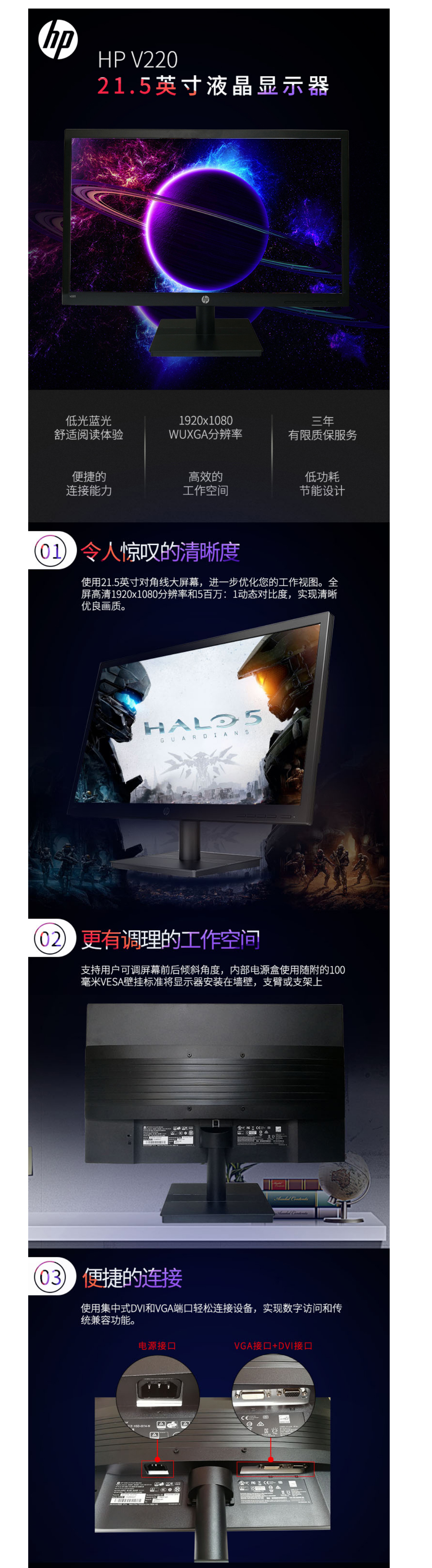 • 商品名称:惠普(HP) V220 21.5英寸 LED商用液晶显示器 电脑显示屏 (21.5英寸) (21.5英寸)