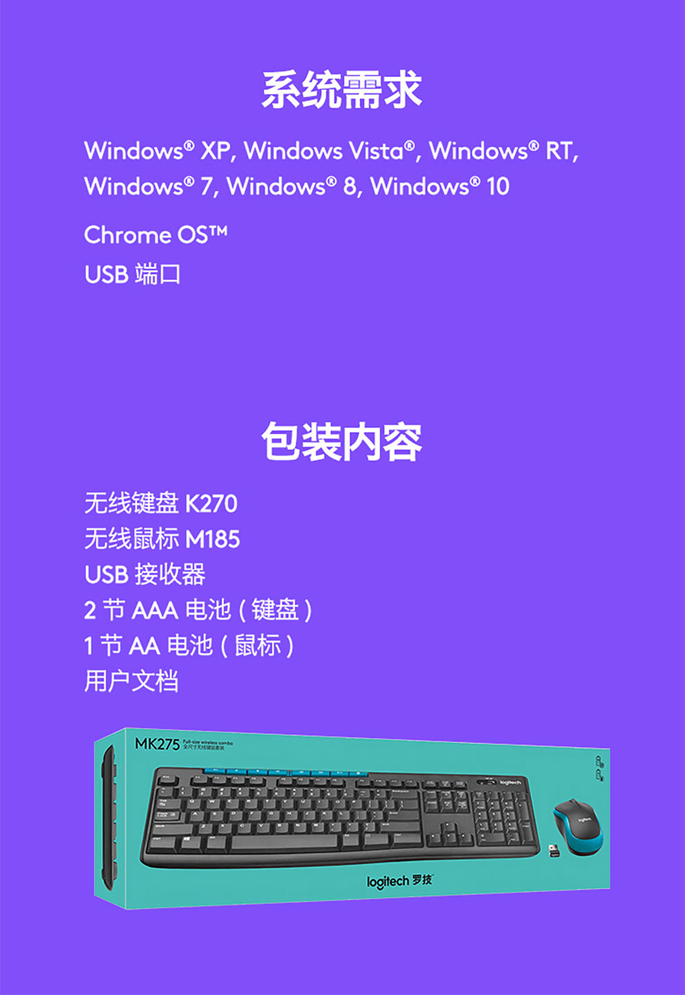 • 商品名称:罗技(Logitech) MK275 键鼠套装 无线光电键鼠套装 无线鼠标无线键盘套装 (MK275)