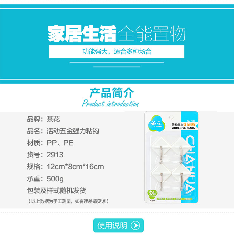• 商品名称:茶花(CHAHUA) 2913 粘钩挂钩贴活动五金强力型 4支装