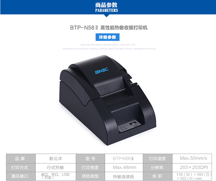 • 商品名称:新北洋(SNBC) BTP-N58II 热敏小票打印机58mm超市收银打印机