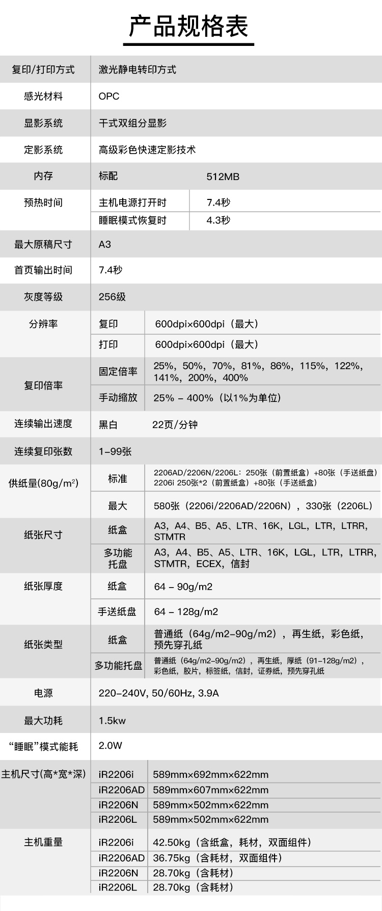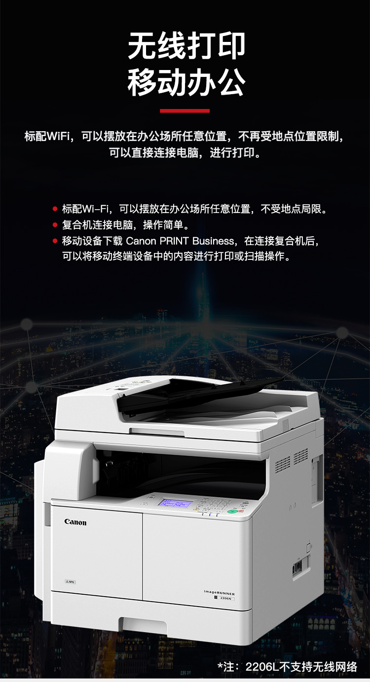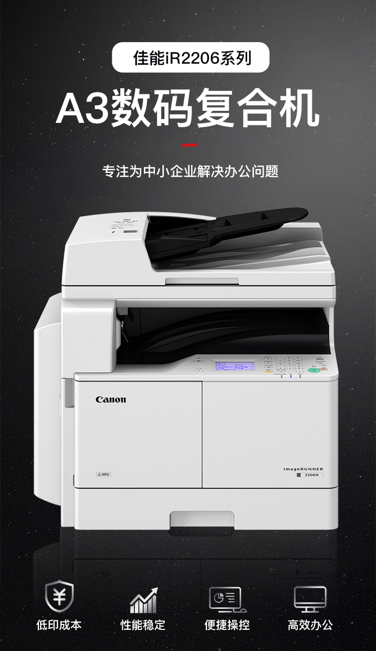 • 商品名称:佳能(Canon) iR2206AD A3黑白数码复合机一体机 打印/复印/扫描/WiFi(含输稿器+双面器)